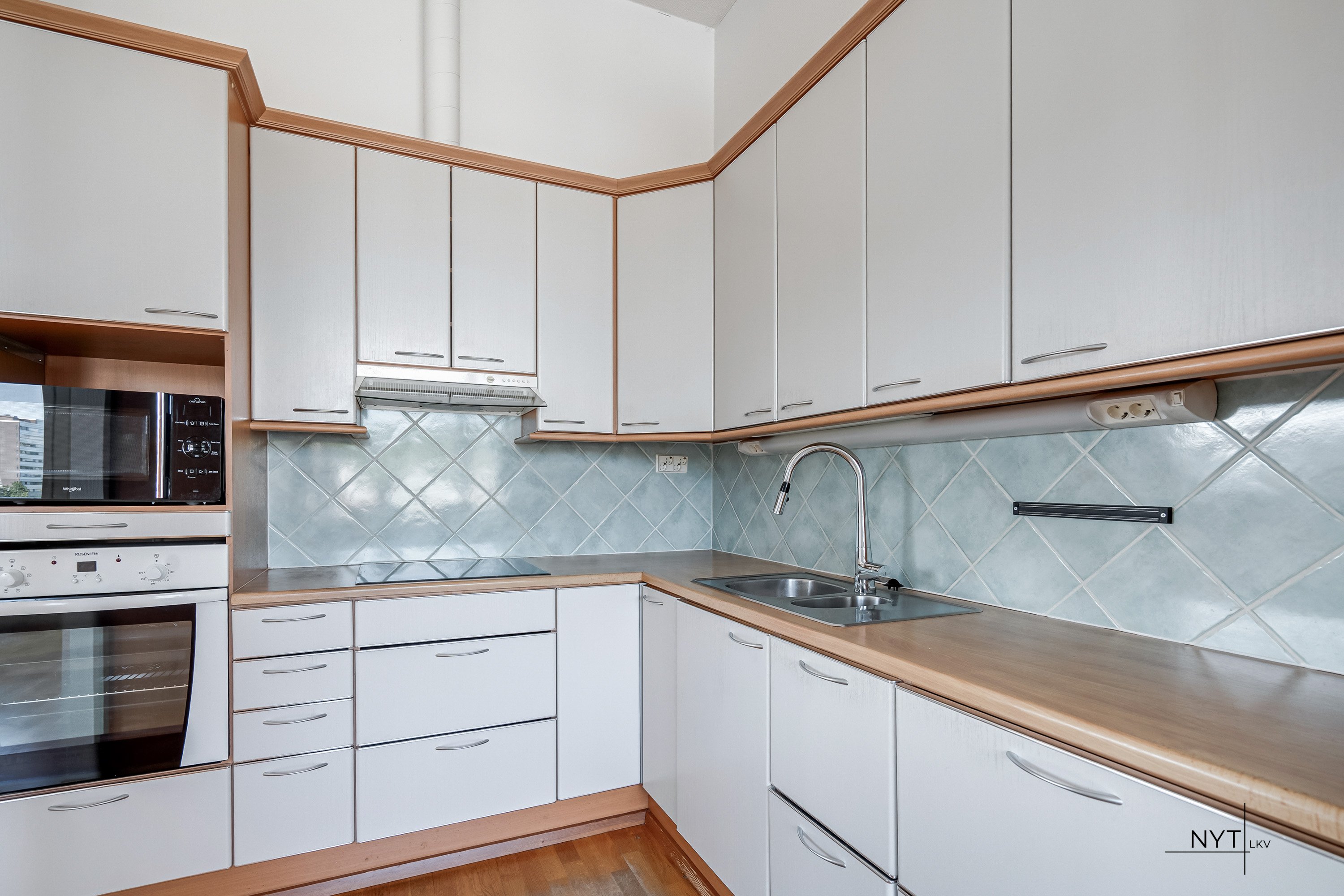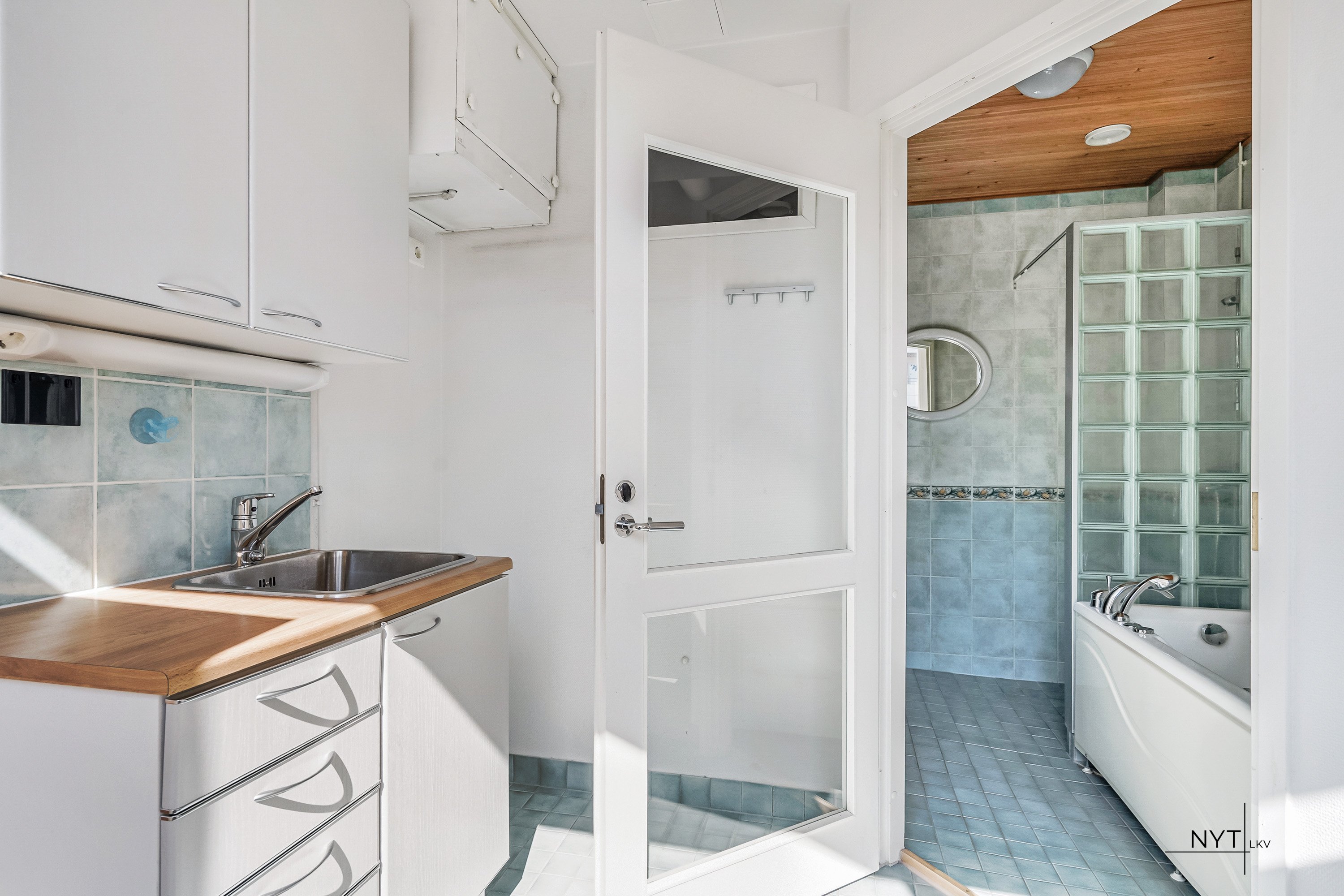 Pesukoneliitäntä, lattialämmitys, pesuallas, pyykkikaapit, pöytätaso ja tila pesutornille
