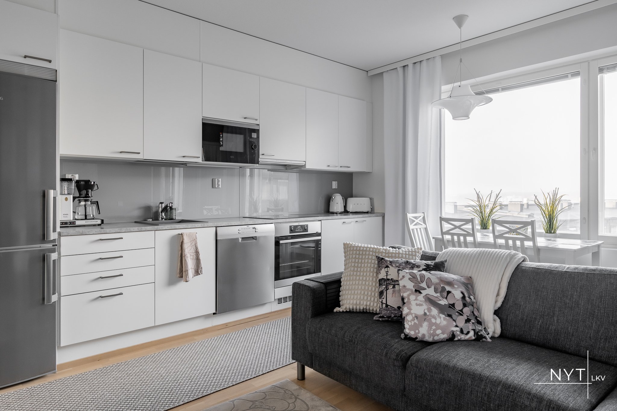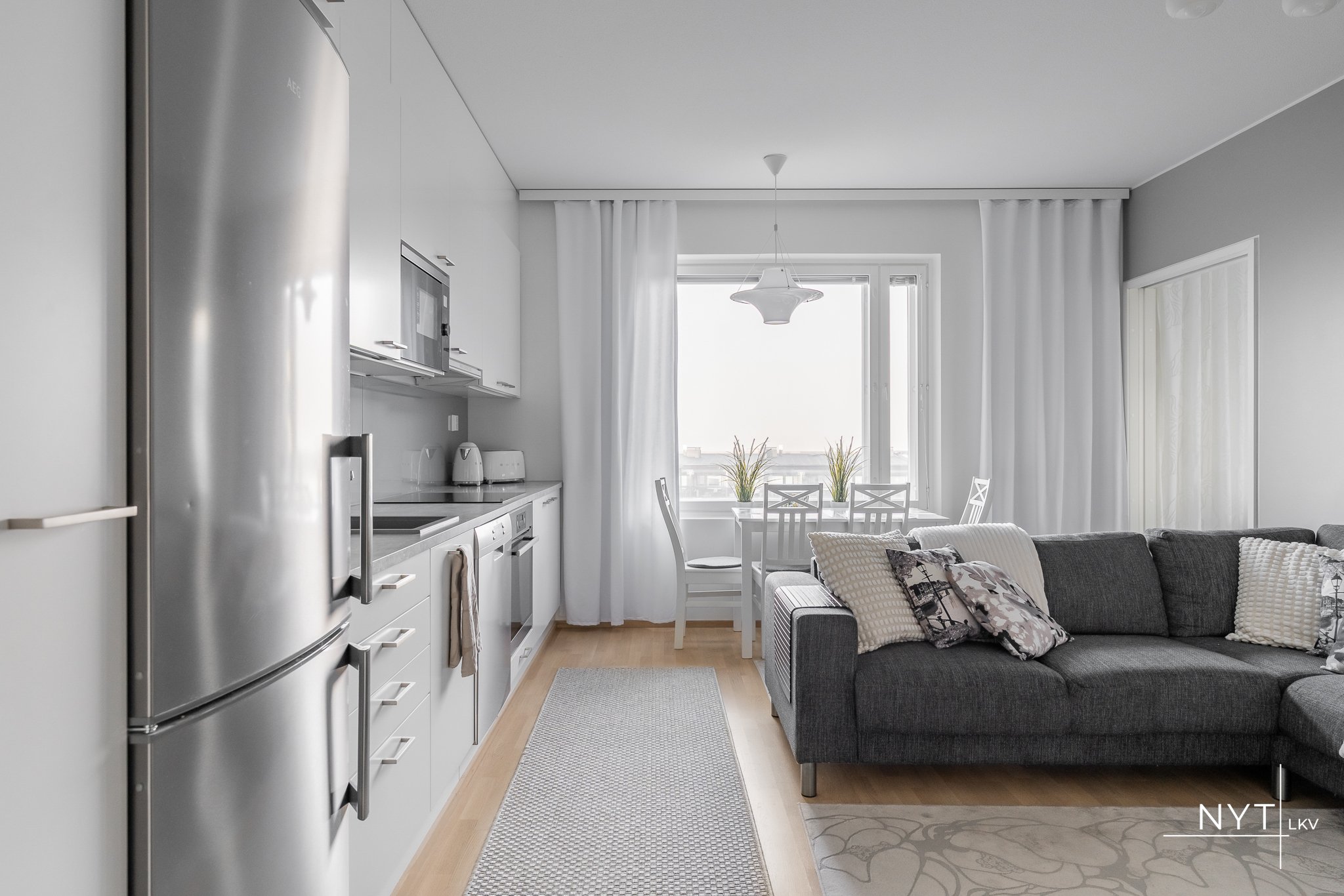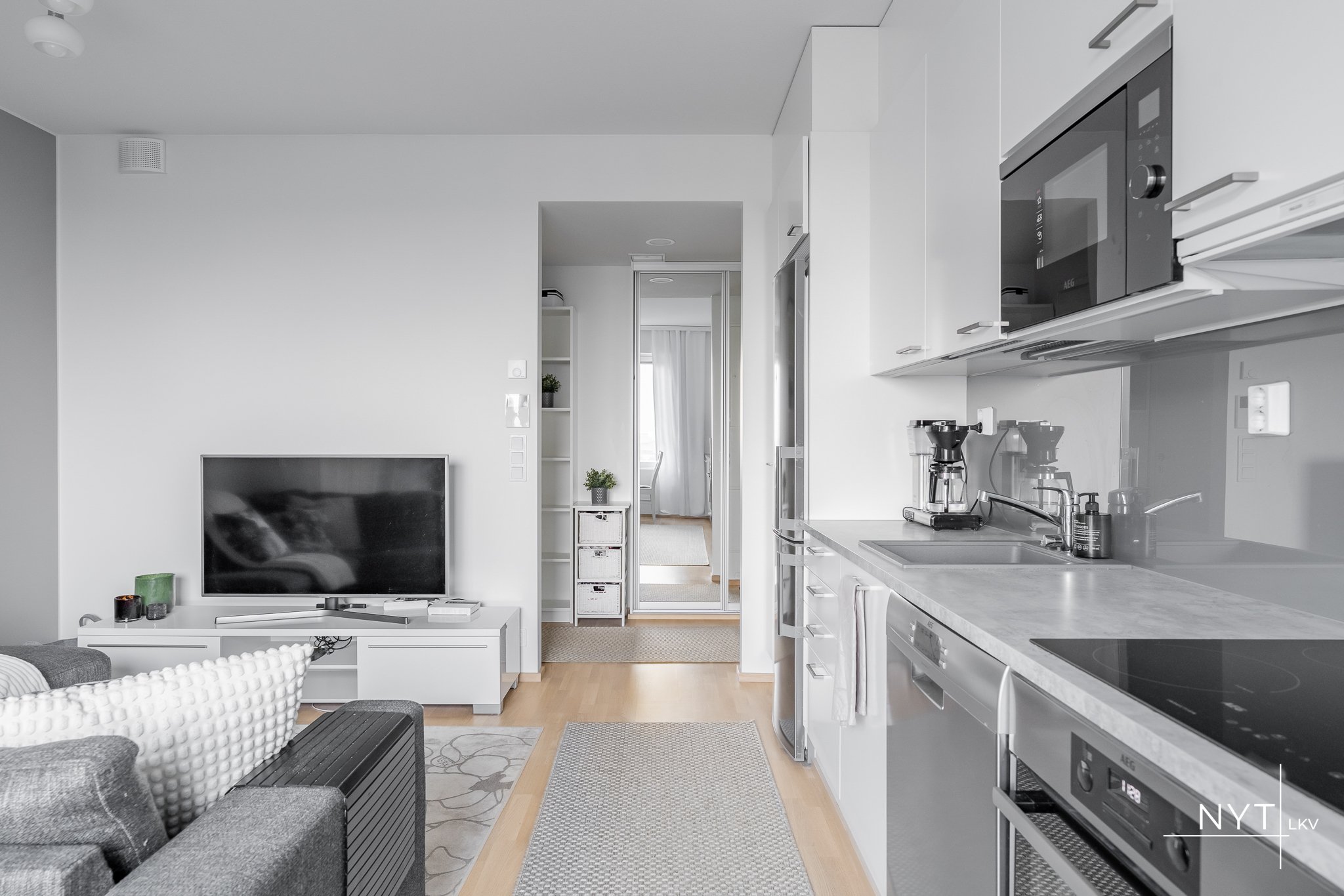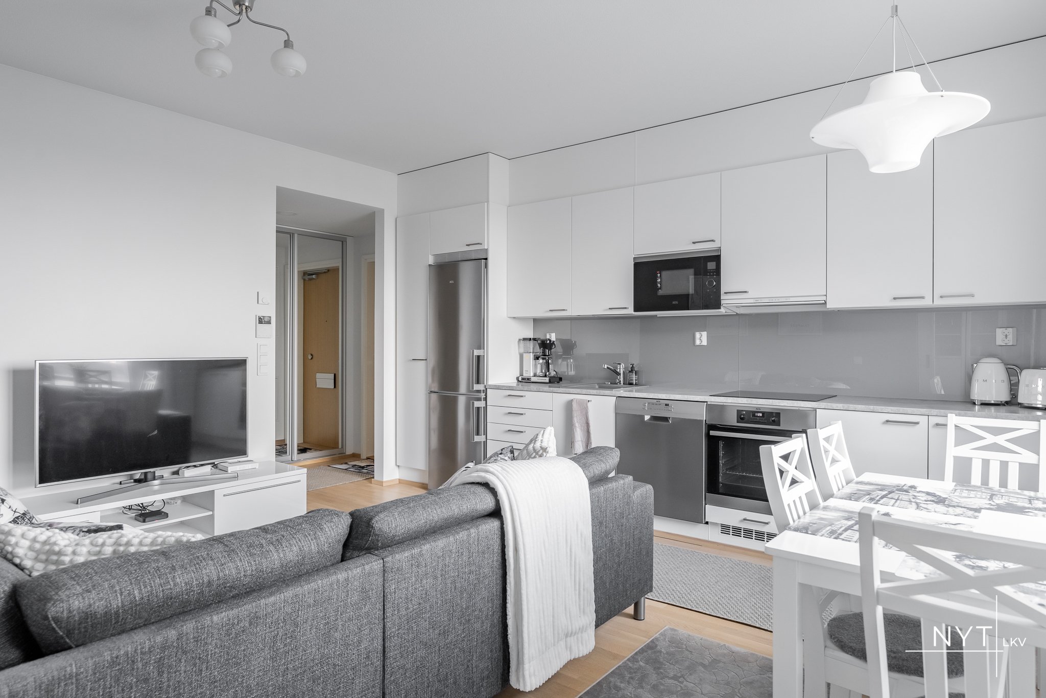 Tämä asunto tuntuu neliöitään (44,50) suuremmalta. Olohuoneen ja avokeittiön yhdistelmä on toimiva kokonaisuus. Tilaan mahtuu suurempikin sohvaryhmä ja neljänhengen ruokaryhmä. Keittiö on varusteltu rosterikodinkoneilla, induktioliedellä ja integroidulla mikrolla.