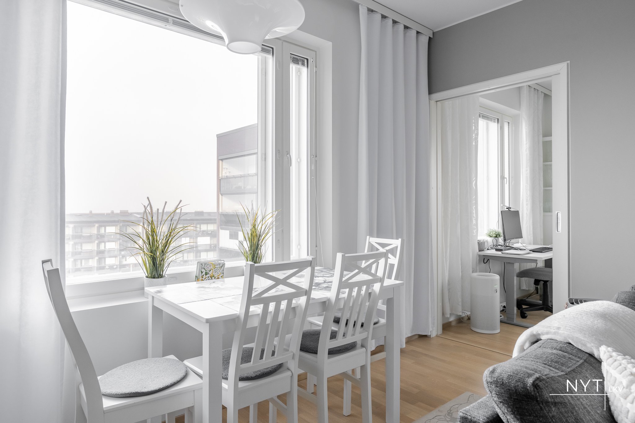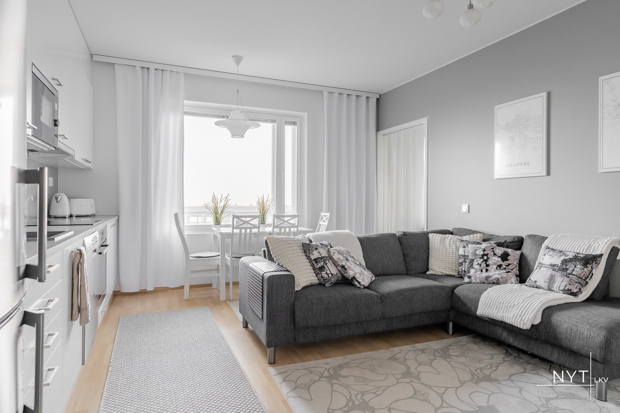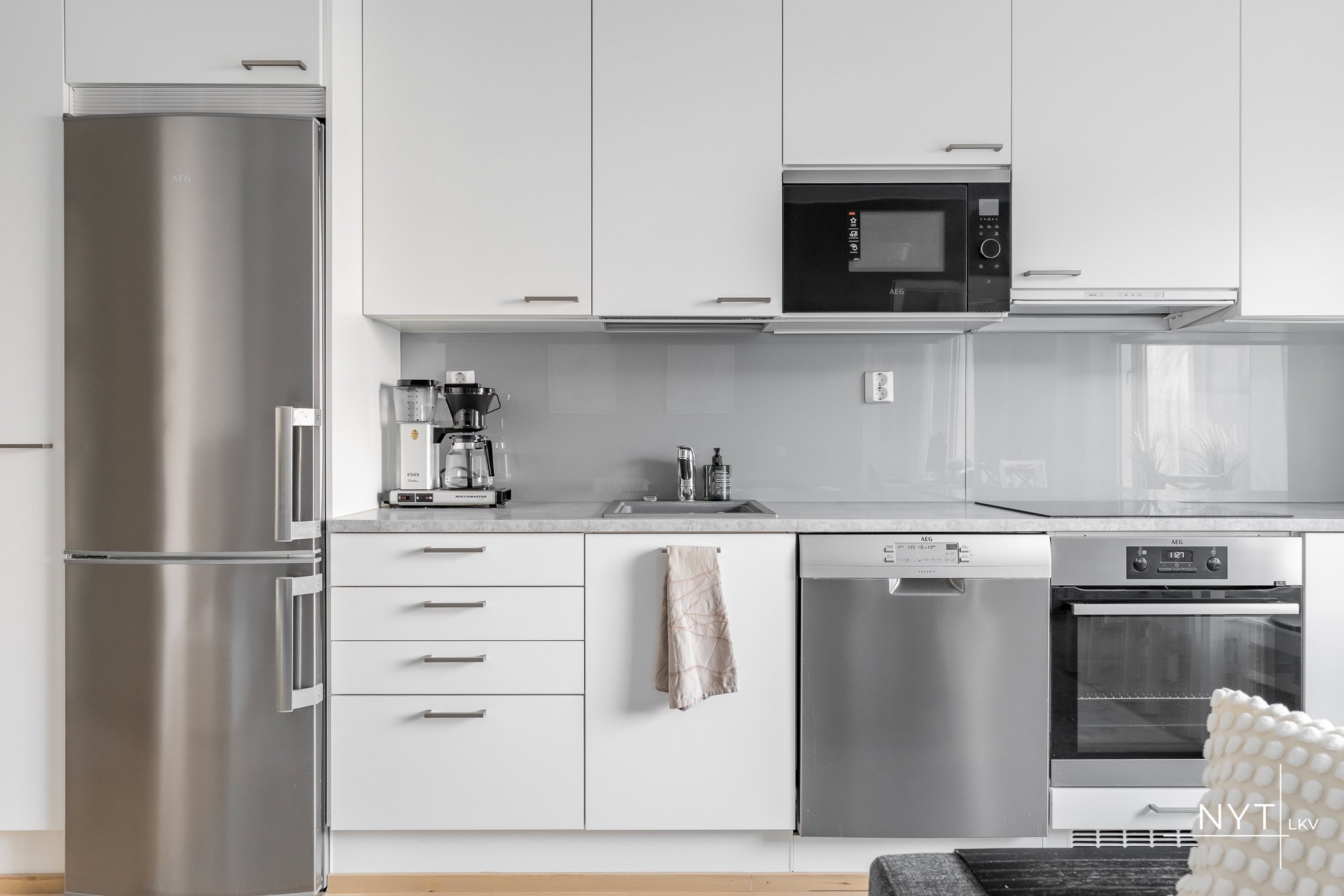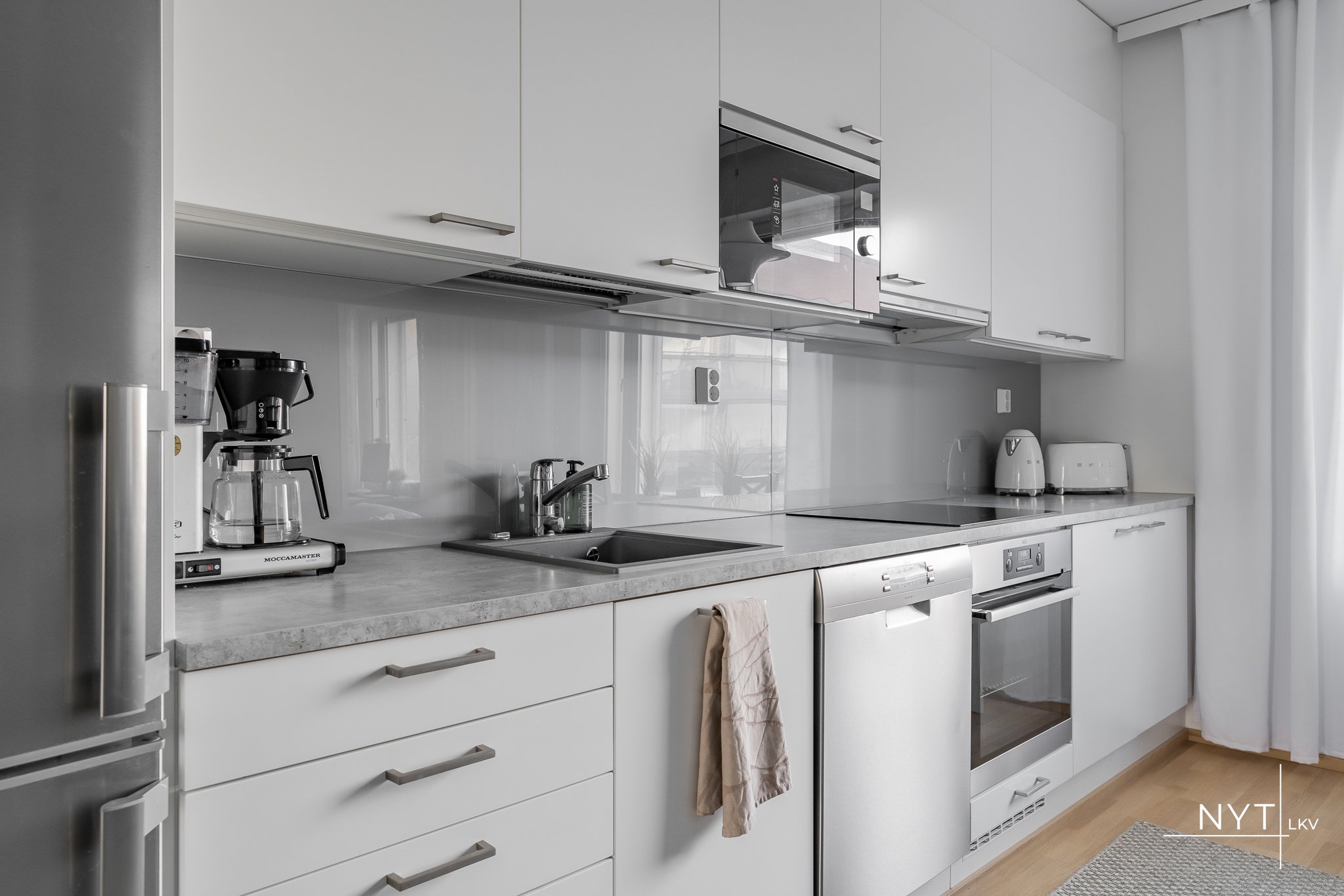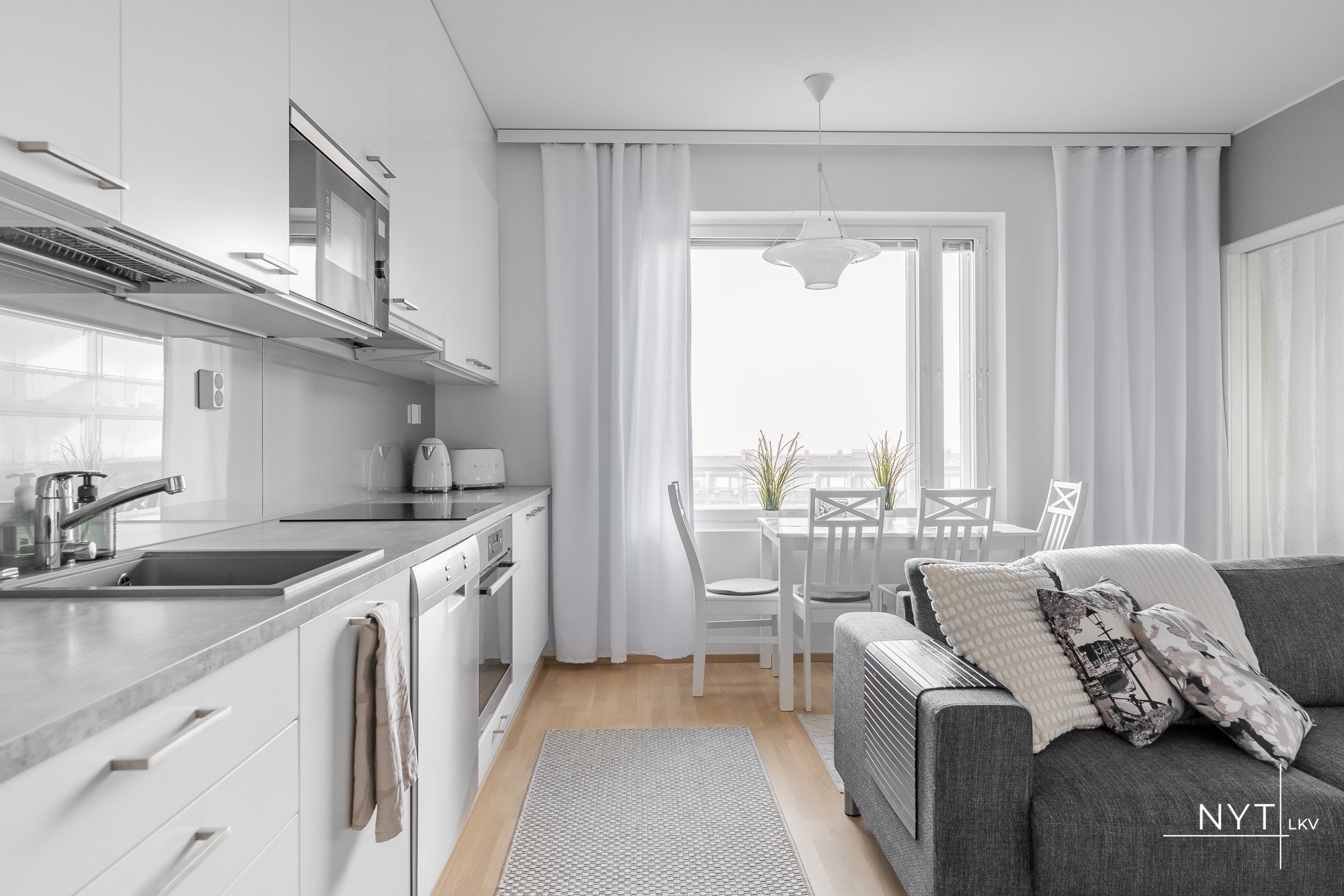 Tämä asunto tuntuu neliöitään (44,50) suuremmalta. Olohuoneen ja avokeittiön yhdistelmä on toimiva kokonaisuus. Tilaan mahtuu suurempikin sohvaryhmä ja neljänhengen ruokaryhmä. Keittiö on varusteltu rosterikodinkoneilla, induktioliedellä ja integroidulla mikrolla.