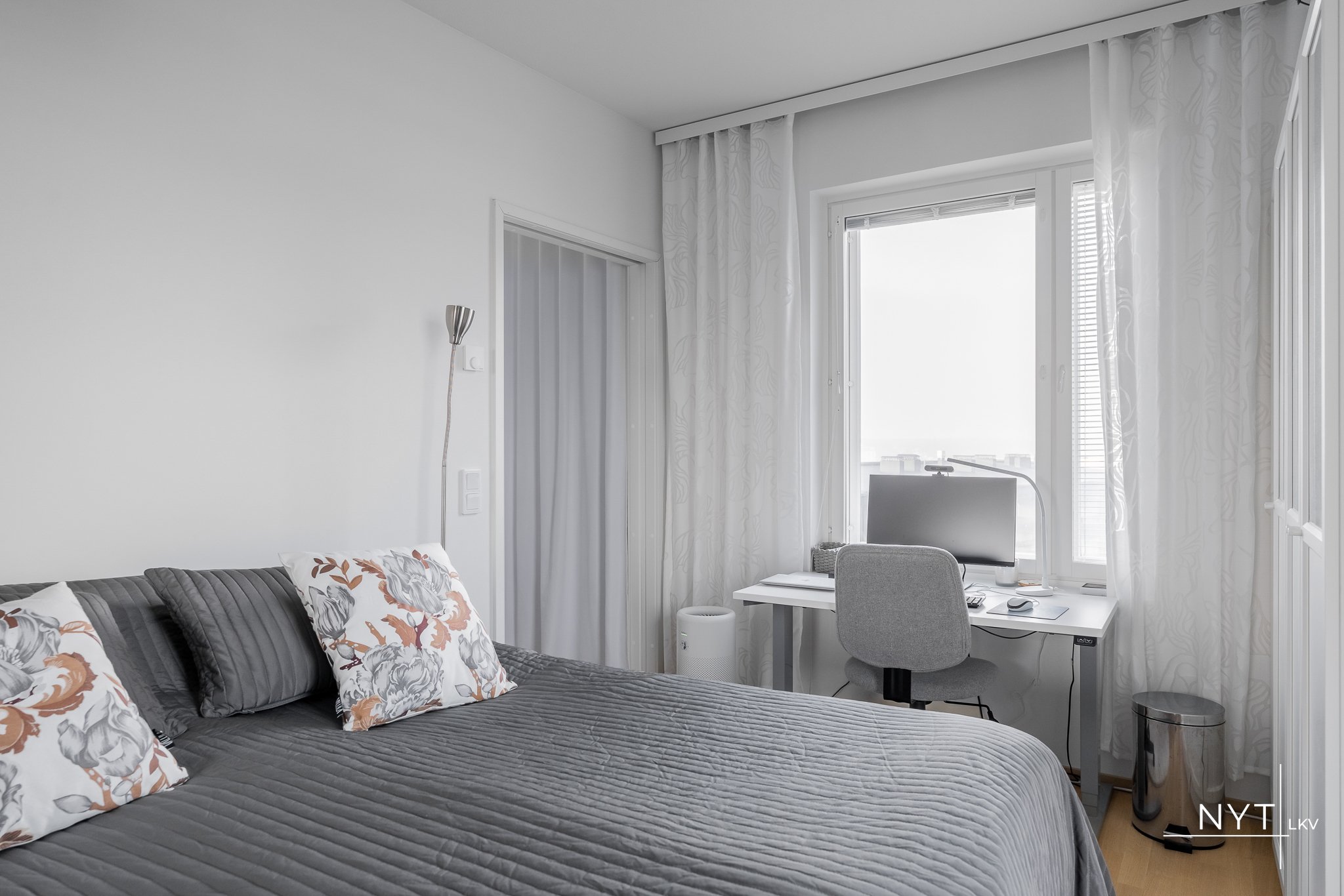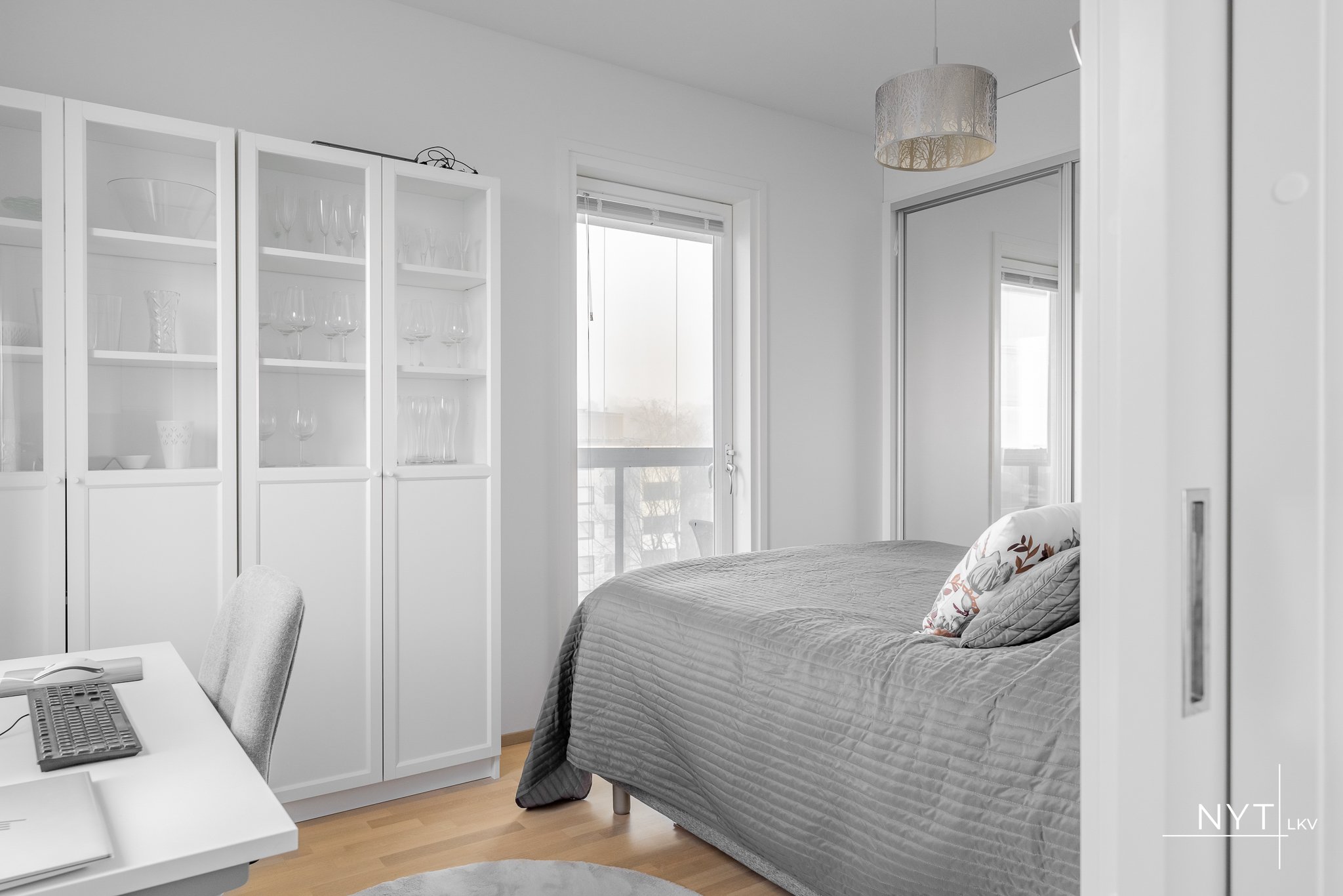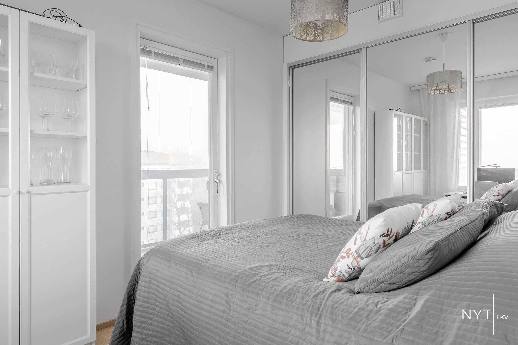 Asunnon makuuhuone on kokoluokassaan tilava ja sisältää kattavasti kaappitilaa avaruutta tuovilla peiliovilla. Huone on eroteltu olohuoneesta seinän sisään liukuvalla ovella. Makkarissa on tilaa parisängylle ja pienelle työpisteelle ja huoneesta on kulku asunnon lasitetulle parvekkeelle, joka toimii lämpiminä vuodenaikoina kuin toisena olohuoneena. Parveke on kokonsa puolesta kalustettavissa monin eri tavoin.