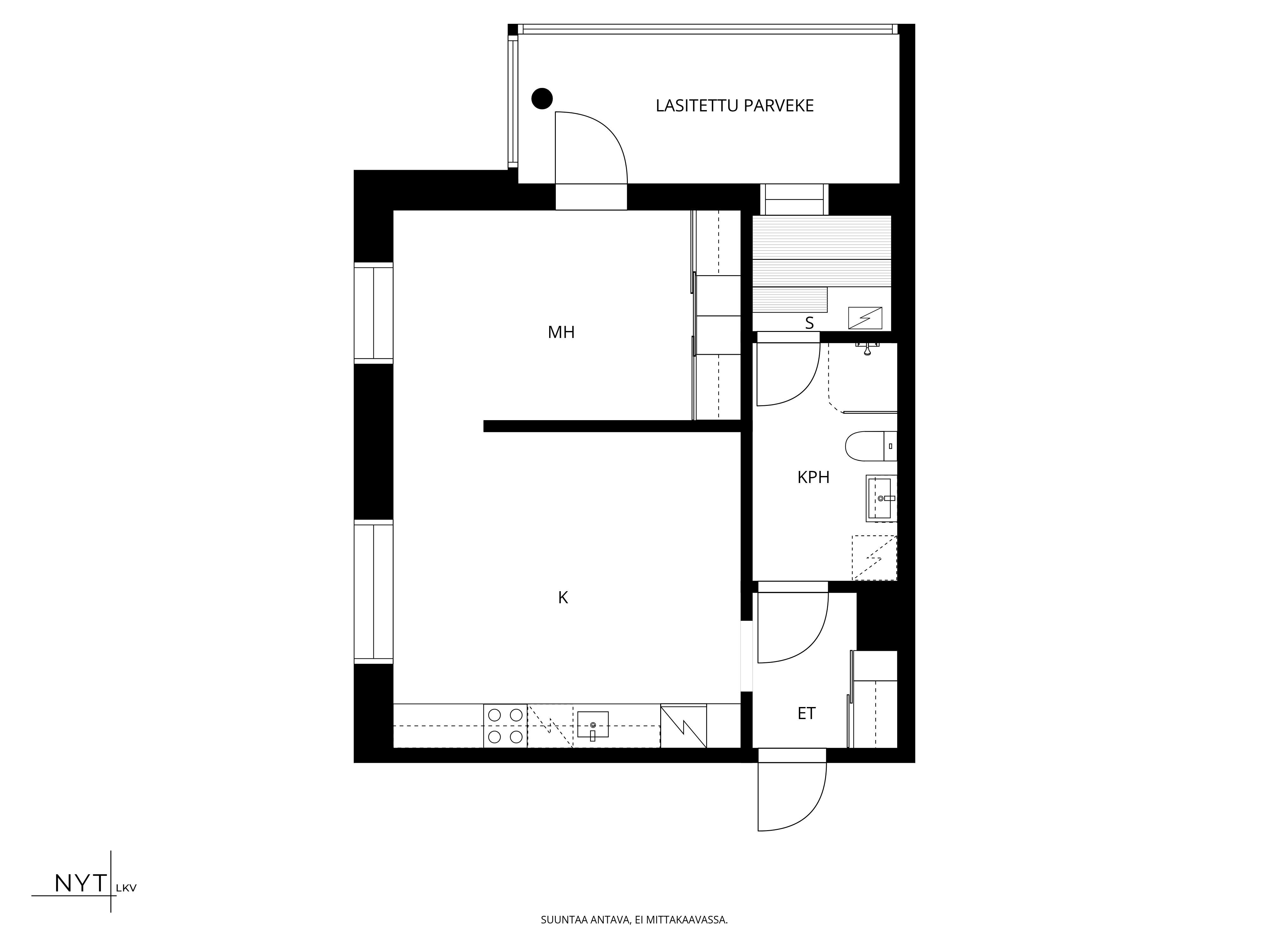 Makuuhuone ja parveke koilliseen Kirkkotielle, olohuone luoteeseen yhtiön sisäpihalle.