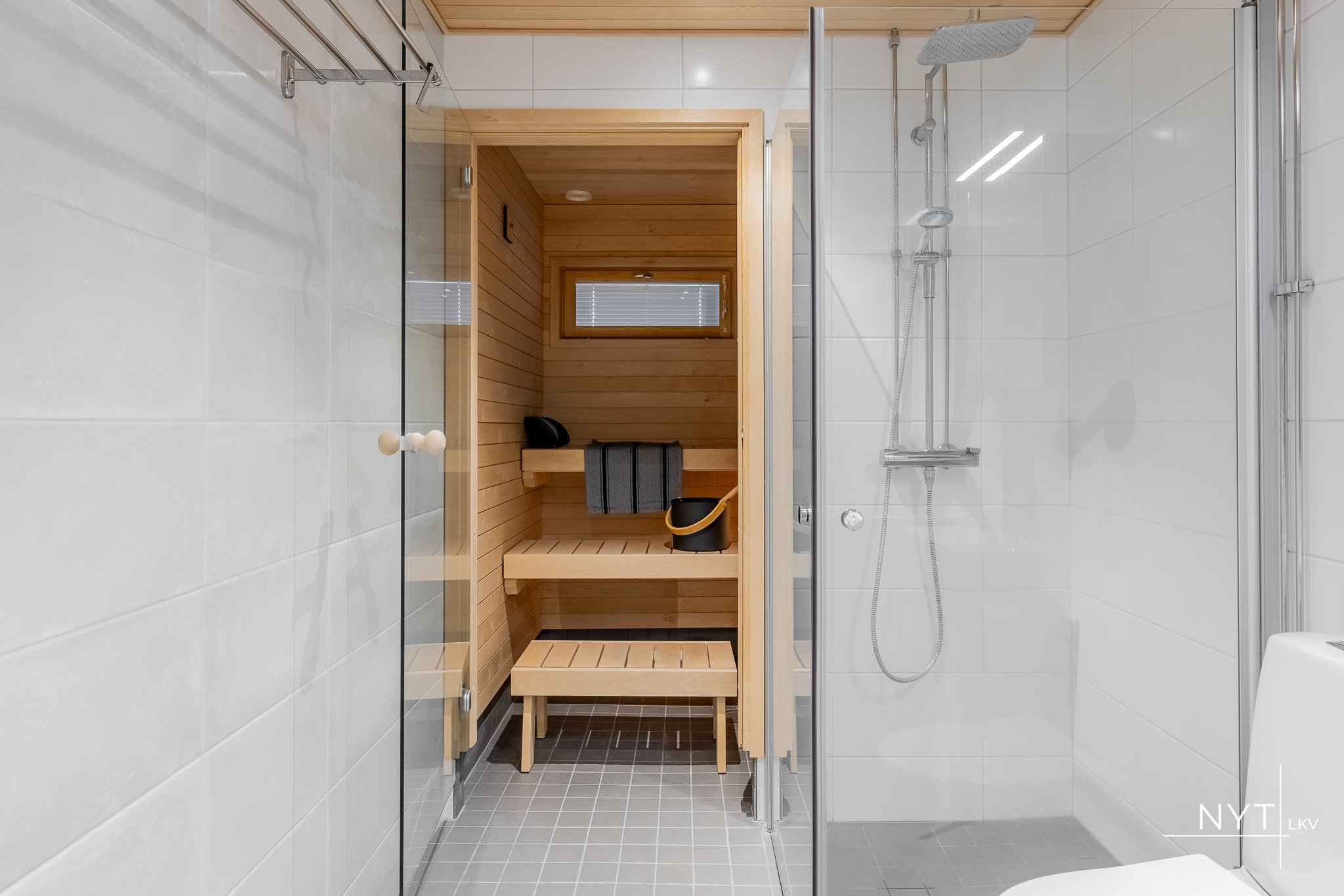 Suihku (sadesuihku), wc-istuin, suihkukaappi, pesukoneliitäntä, lattialämmitys, peilikaappi, pesuallas, allaskaappi ja bidee-suihku