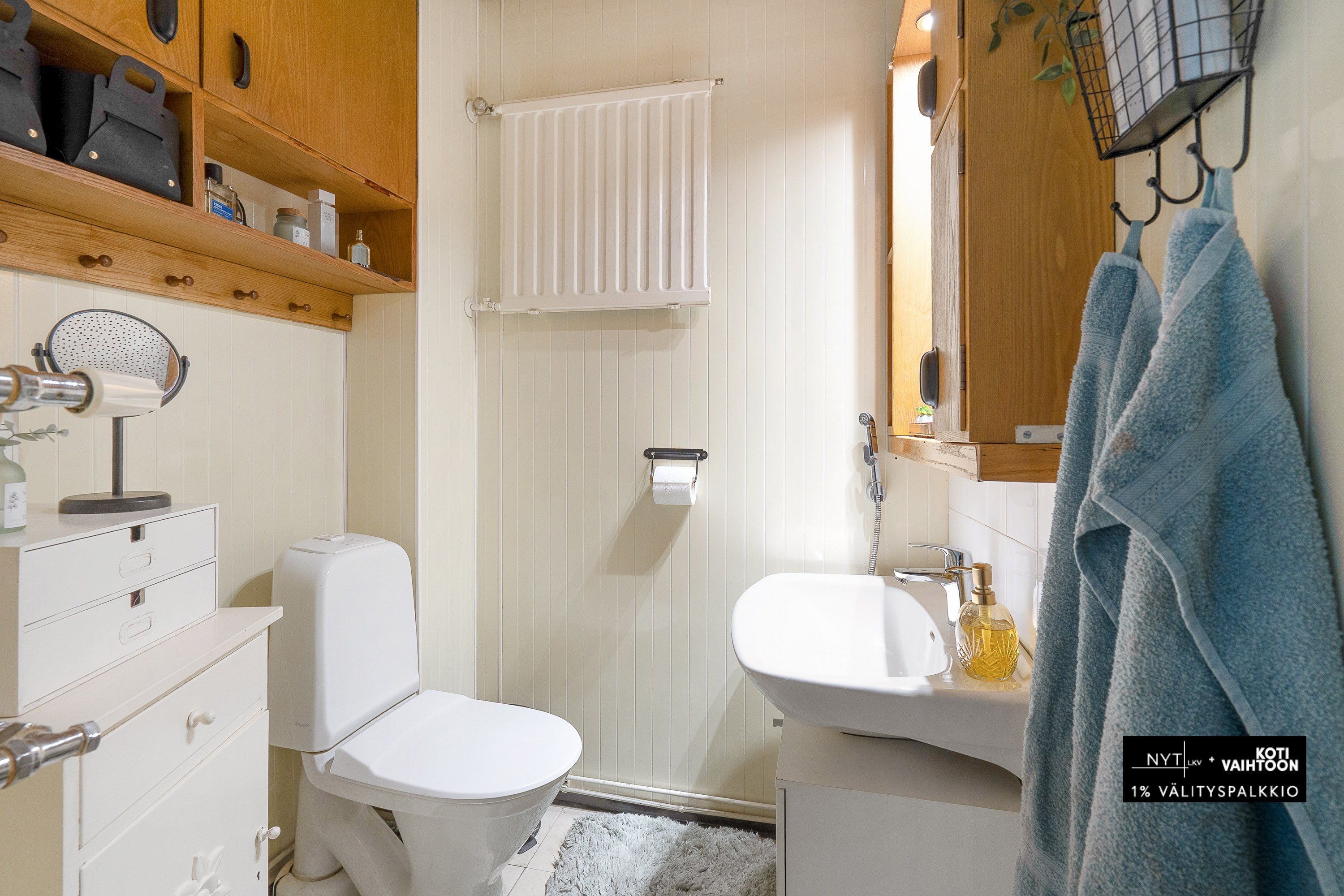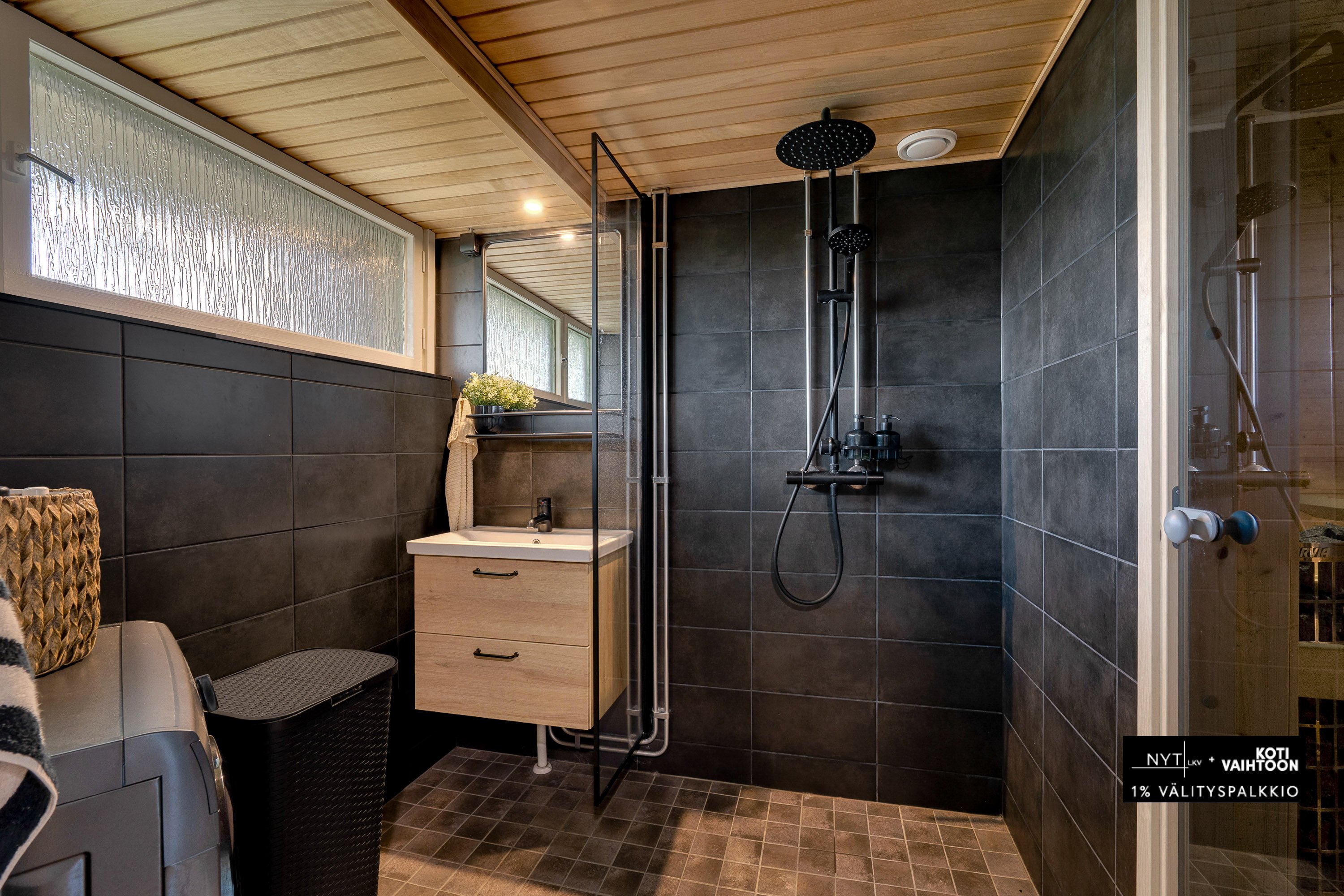 Suihku, suihkuseinä, pesukoneliitäntä, lattialämmitys, peili, pesuallas ja allaskaappi