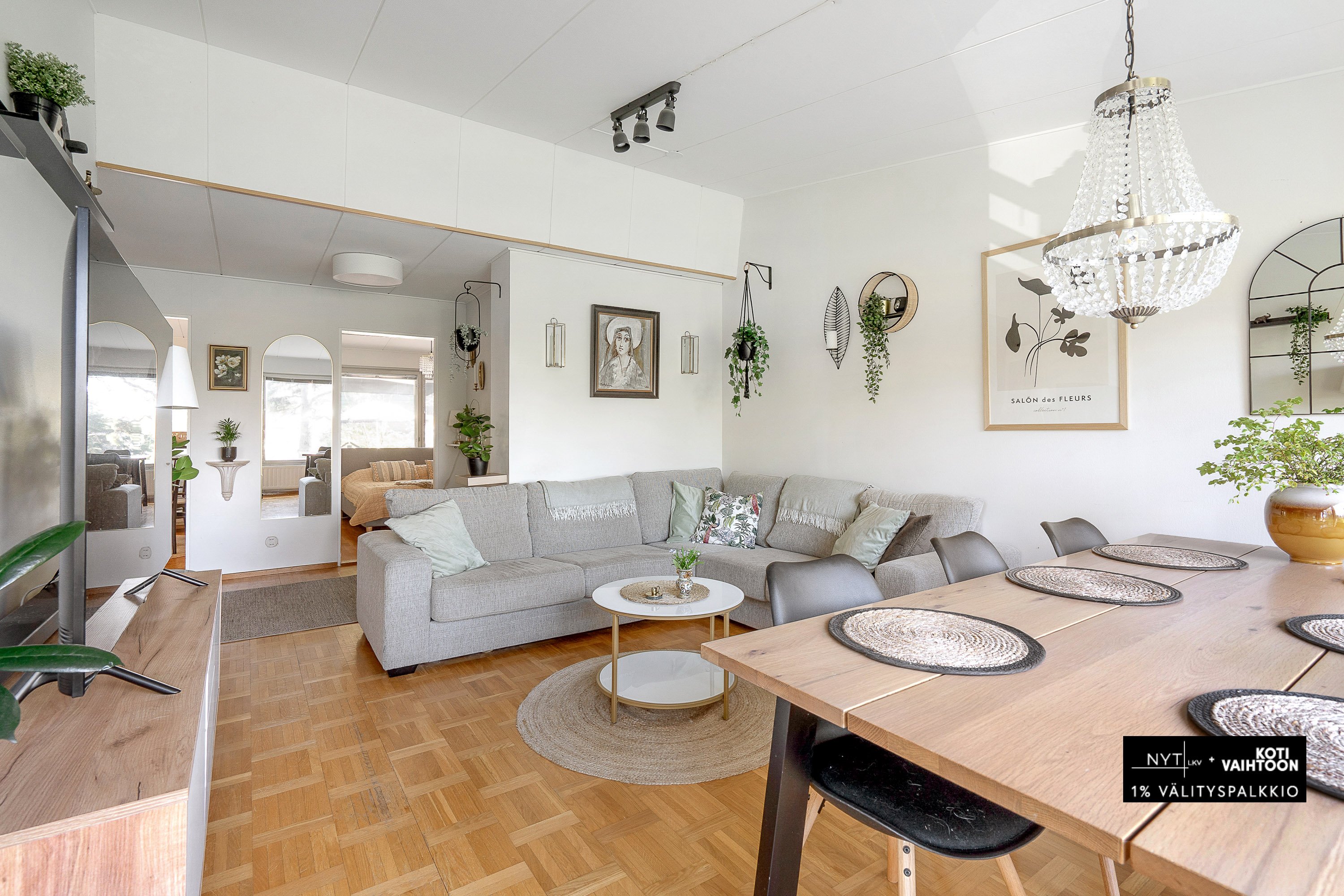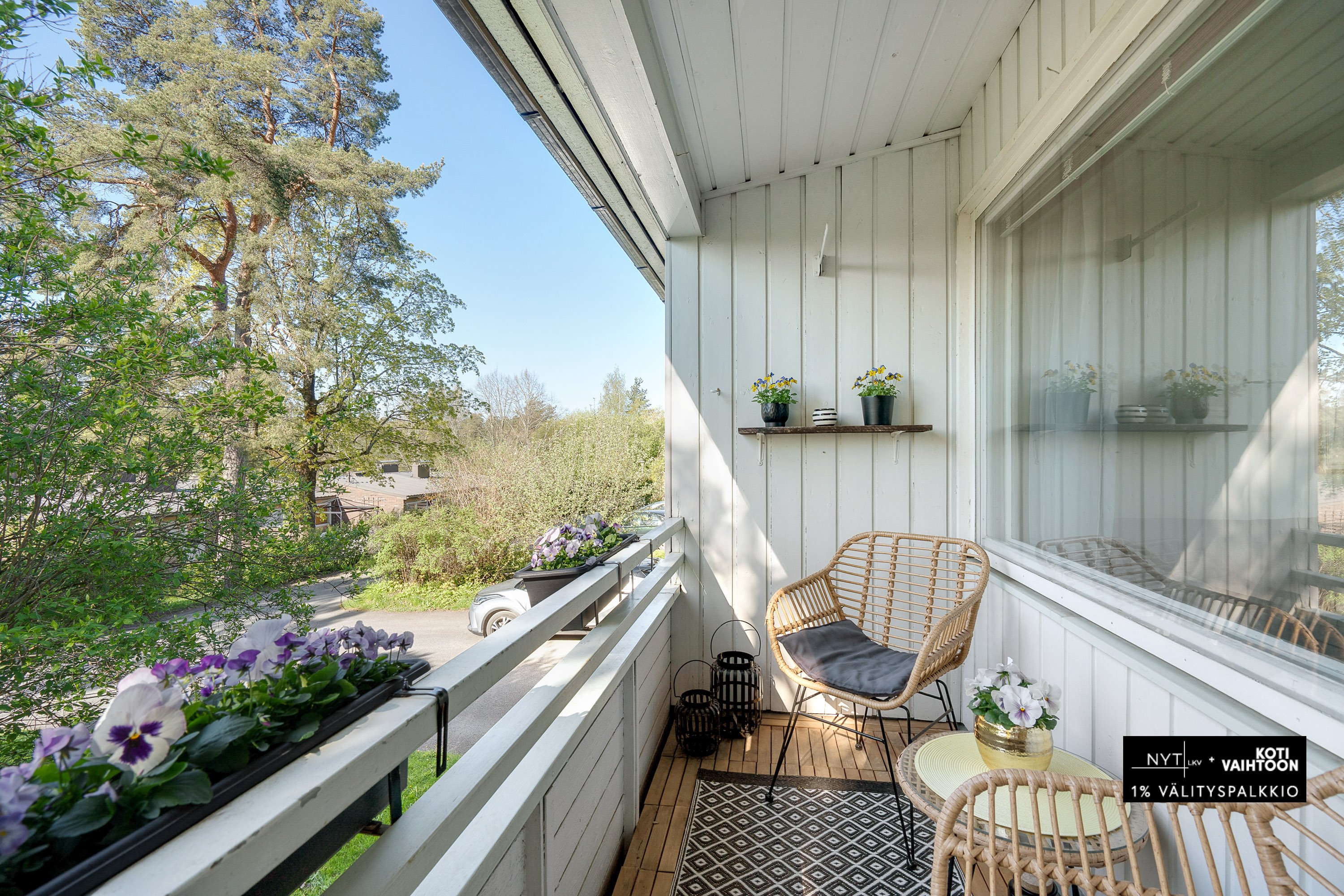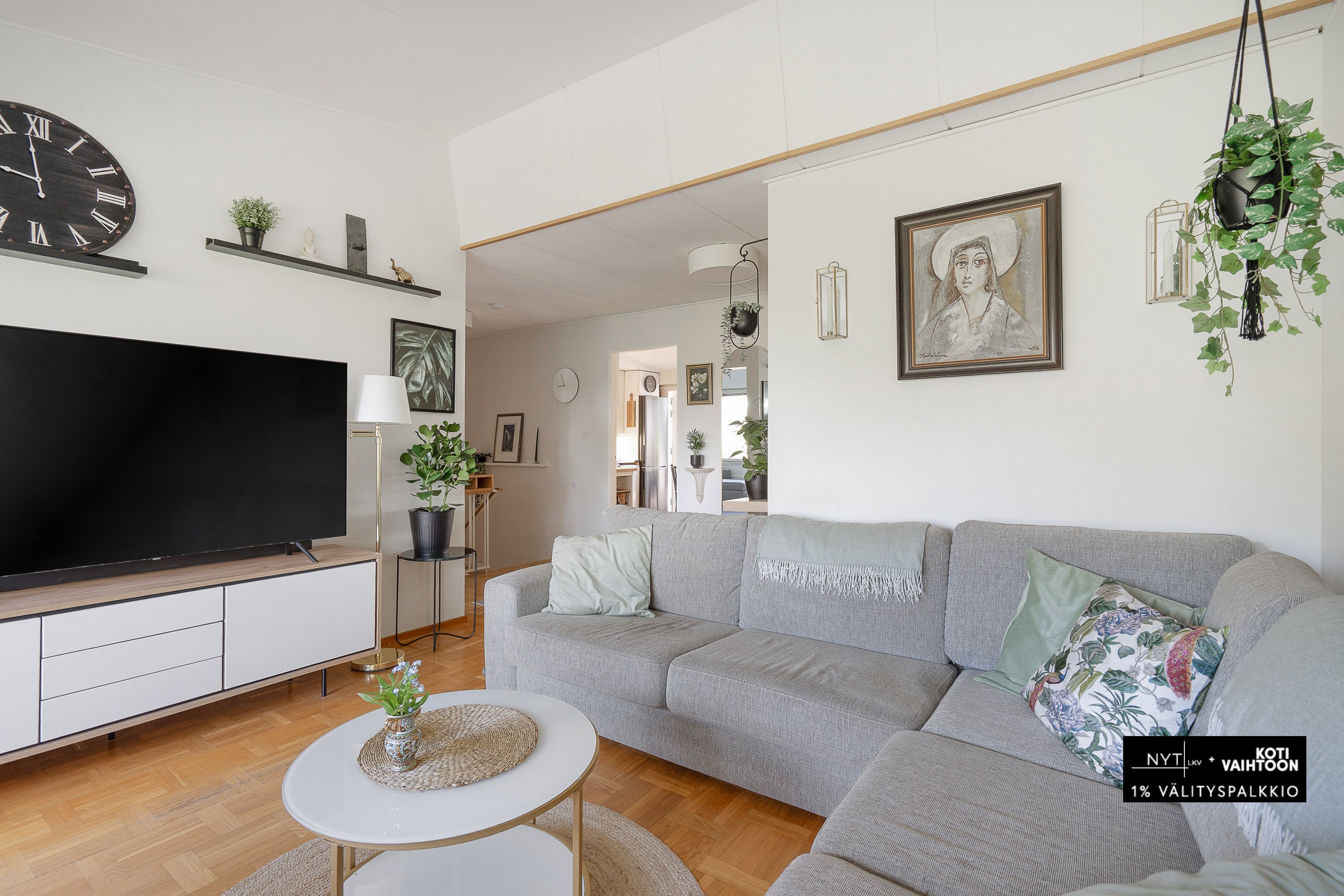 Olohuoneen viistekatto luo tilaan avaraa ja valoisaa tunnelmaa. Olohuoneessa hyvin tilaa kalustukseen, niin ruoka- ja sohvaryhmälle. Olohuoneesta kulku asunnon etelään suuntaavalle parvekkeelle. Yläkerrassa kaksi makuuhuonetta, joista molemmat varusteltu hyvin kaappitiloin.