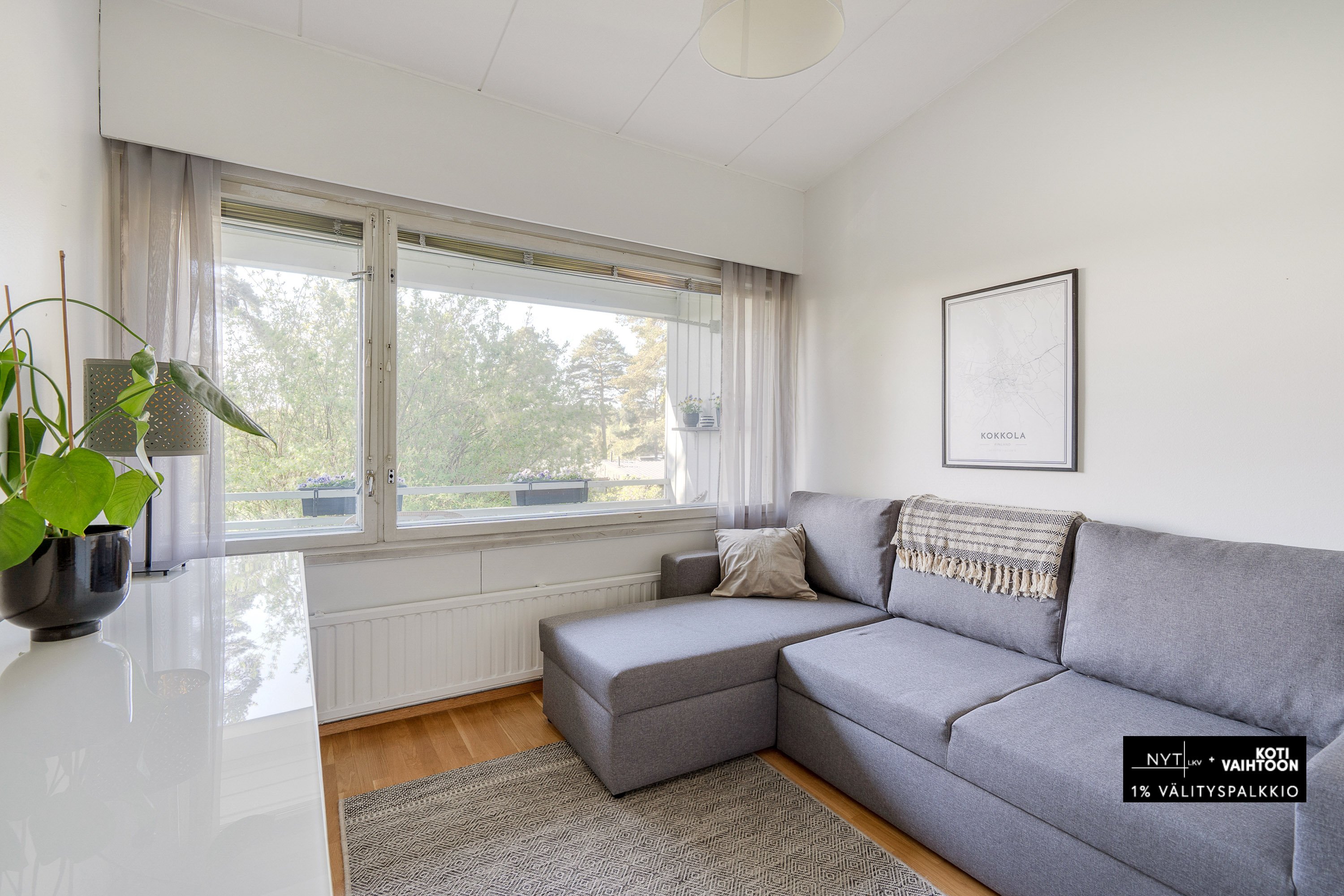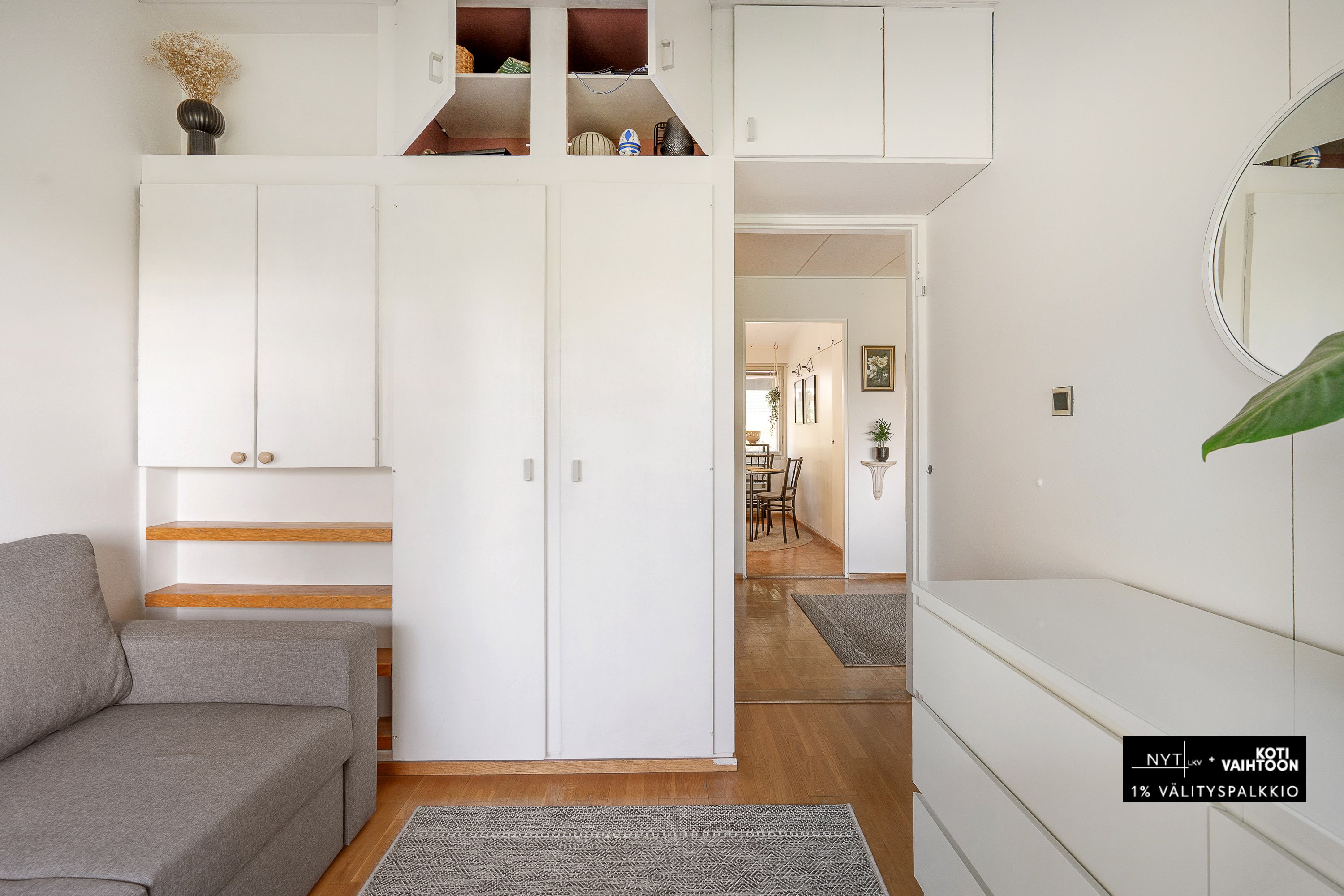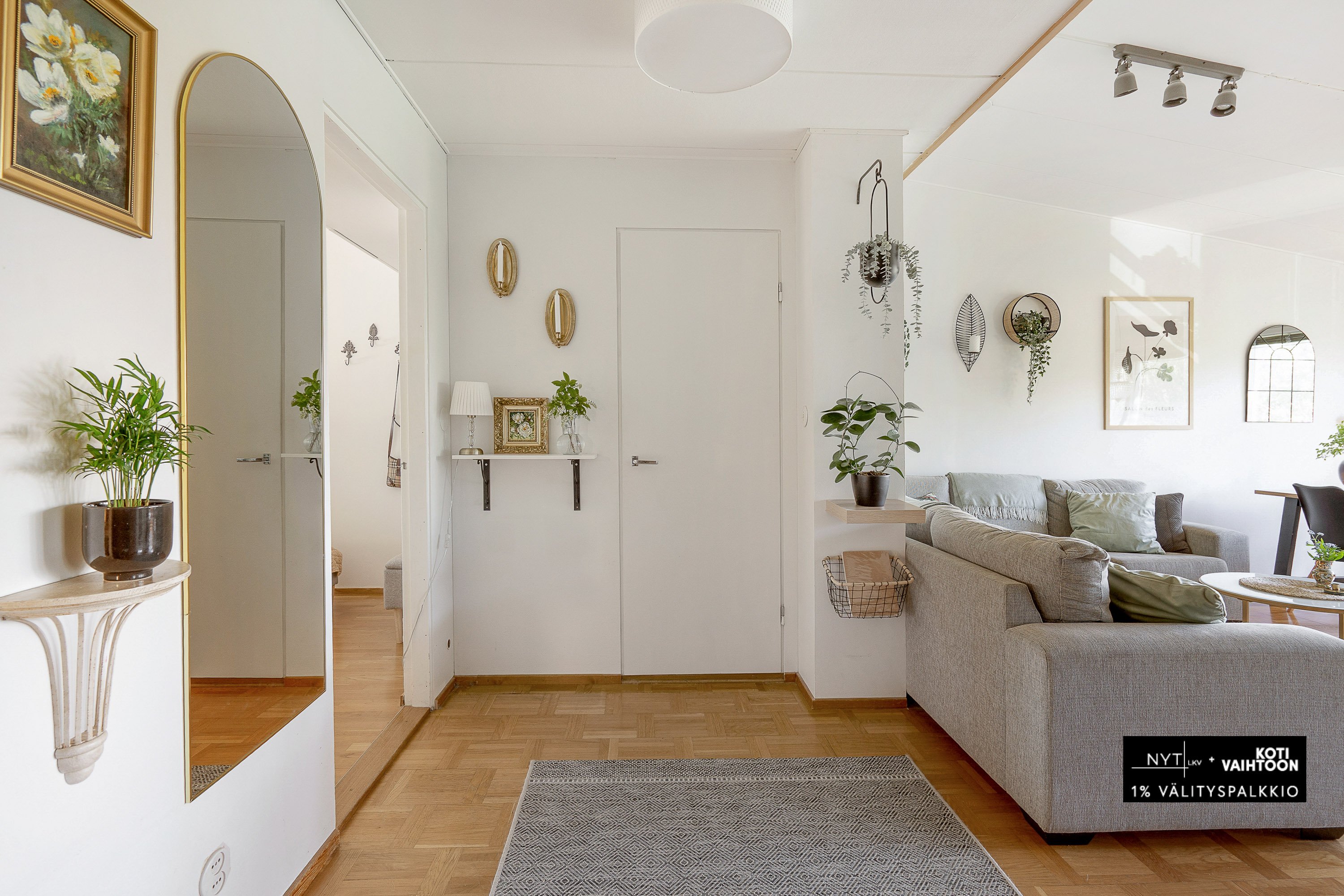 Olohuoneen viistekatto luo tilaan avaraa ja valoisaa tunnelmaa. Olohuoneessa hyvin tilaa kalustukseen, niin ruoka- ja sohvaryhmälle. Olohuoneesta kulku asunnon etelään suuntaavalle parvekkeelle. Yläkerrassa kaksi makuuhuonetta, joista molemmat varusteltu hyvin kaappitiloin.