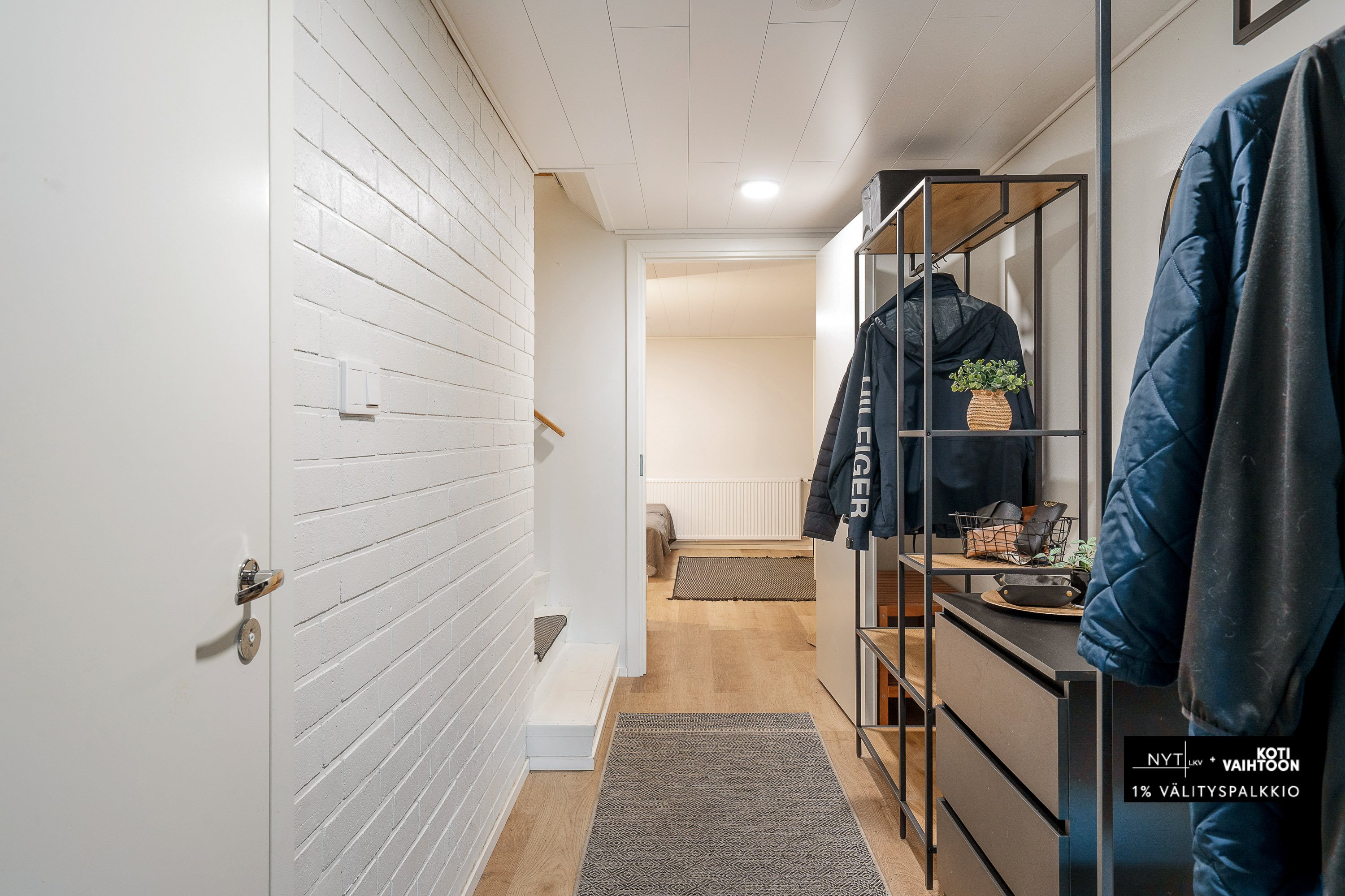 Sisäänkäynti asuntoon tapahtuu alakertaan. Alakerta muodostuu 2023 taloyhtiön remontoimasta kylpyhuoneesta, avoimesta huonetilasta ja huoneesta. Huone toimii erinomaisesti esimerkiksi varastona, työhuoneena tai harrastetilana. Alakerrasta kulku asunnon autotalliin. Talliin mahtuu hyvin auto, se on lämmintä tilaa ja siellä on vesipiste. Autotallin lisäksi asunnon edustalla tilaa kahden auton pysäköintiin.