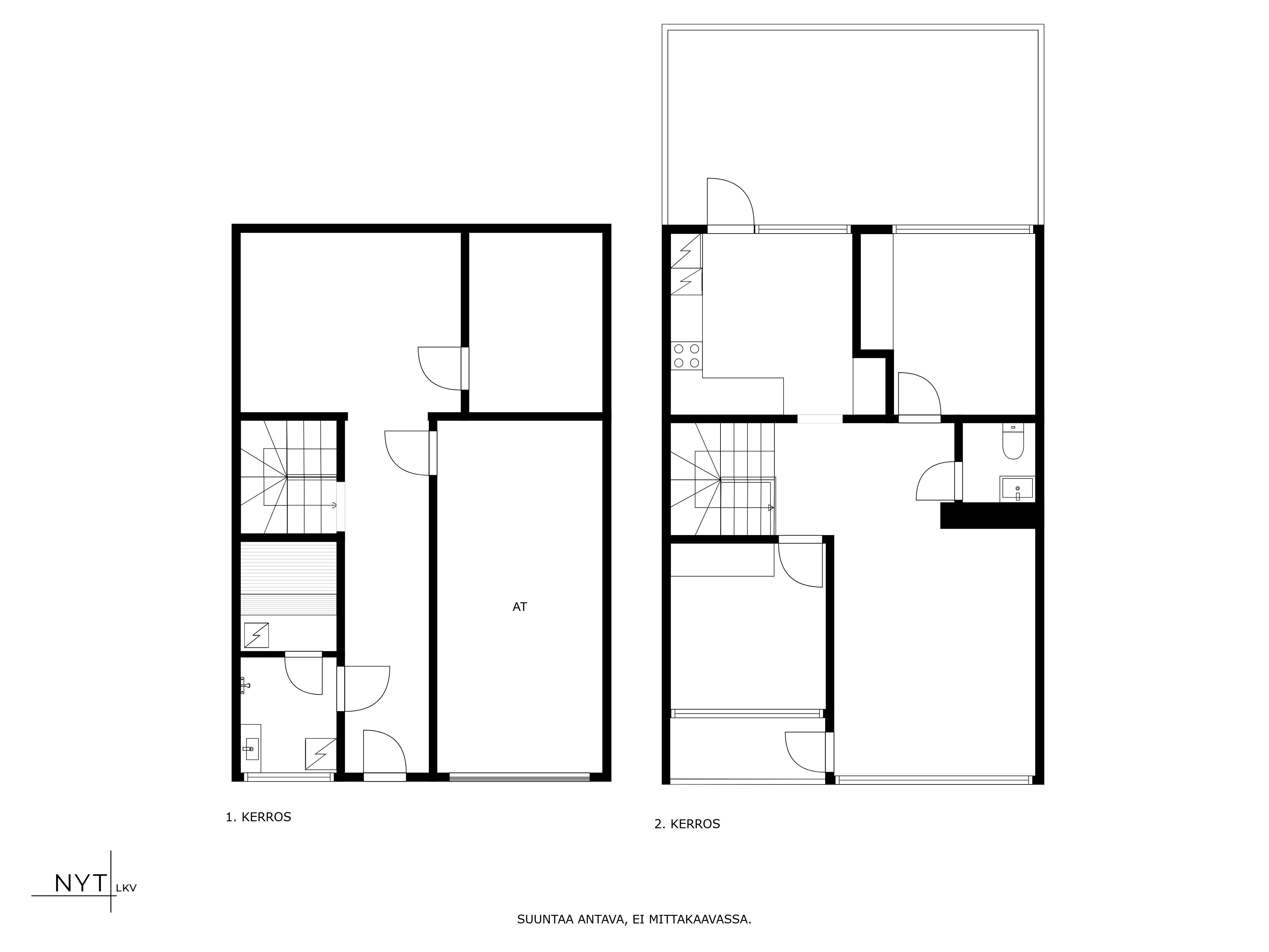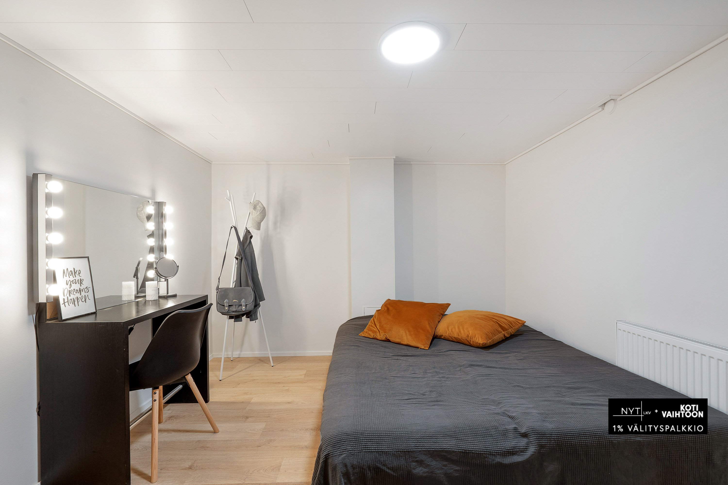 Kaksi makuuhuonetta yläkerrassa. Alakerrassa monikäyttöistä tilaa, jota voi myös käyttää kolmantena ja neljäntenä makuutilana.