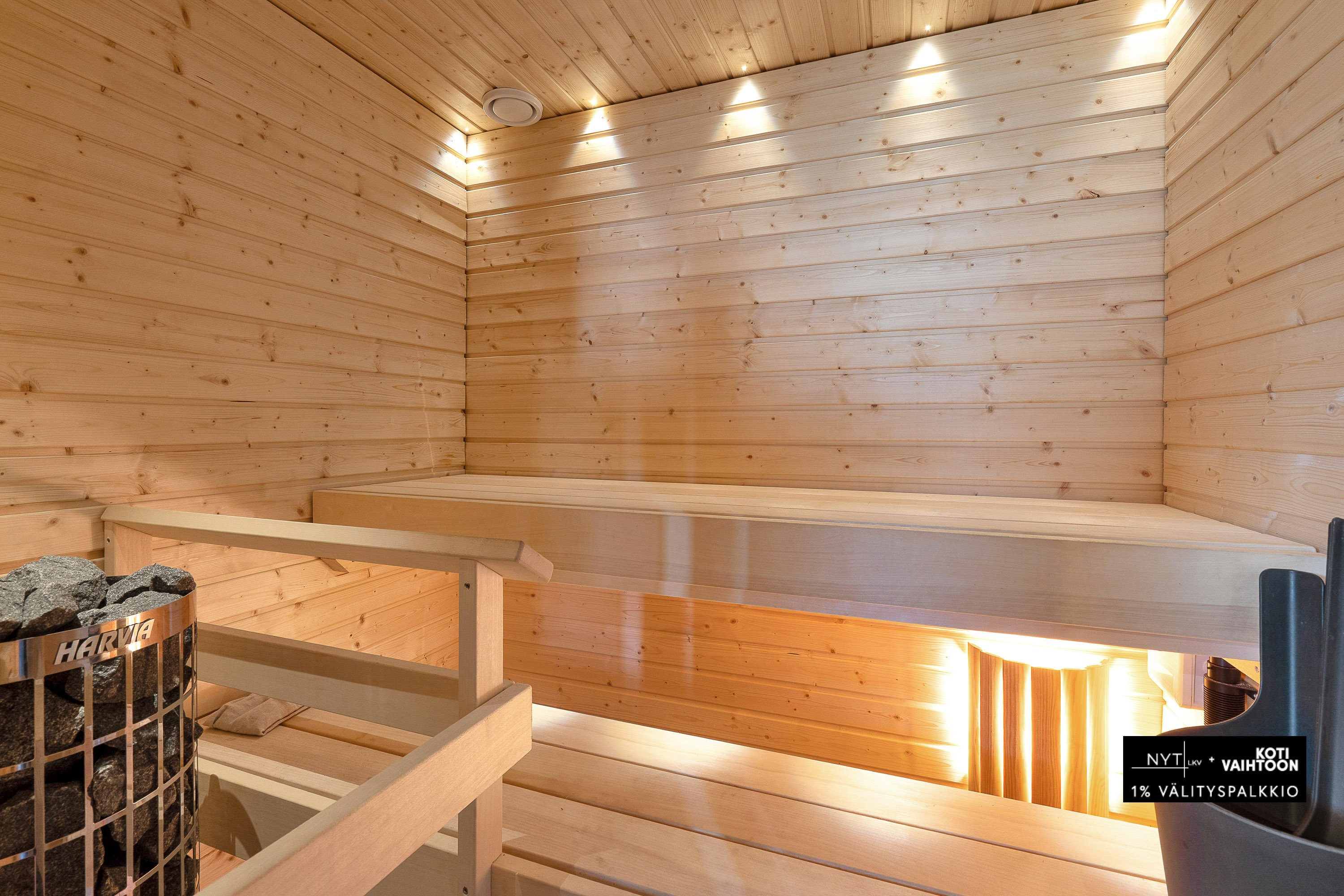 Asunto on yhtiöjärjestyksen mukaan 76 neliötä, jonka lisäksi asunnossa on niin kutsuttu 54 neliön 'aputila', joka kattaa koko alakerran.