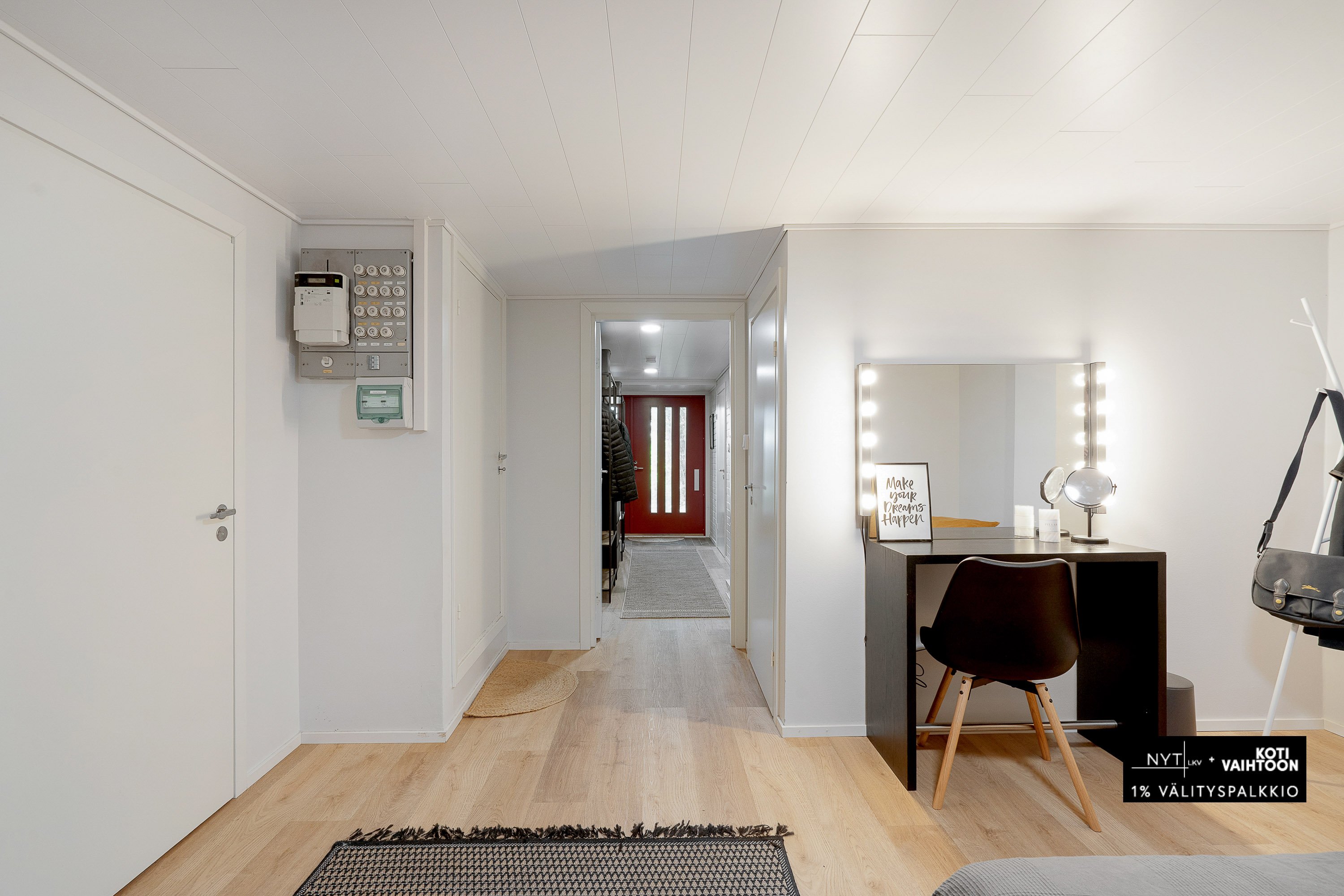 Asunnon etupihalle mahtuu kaksi autoa vieretysten. Asuntoon kuuluu lisäksi autotalli, johon on suora kulku sisältä.
