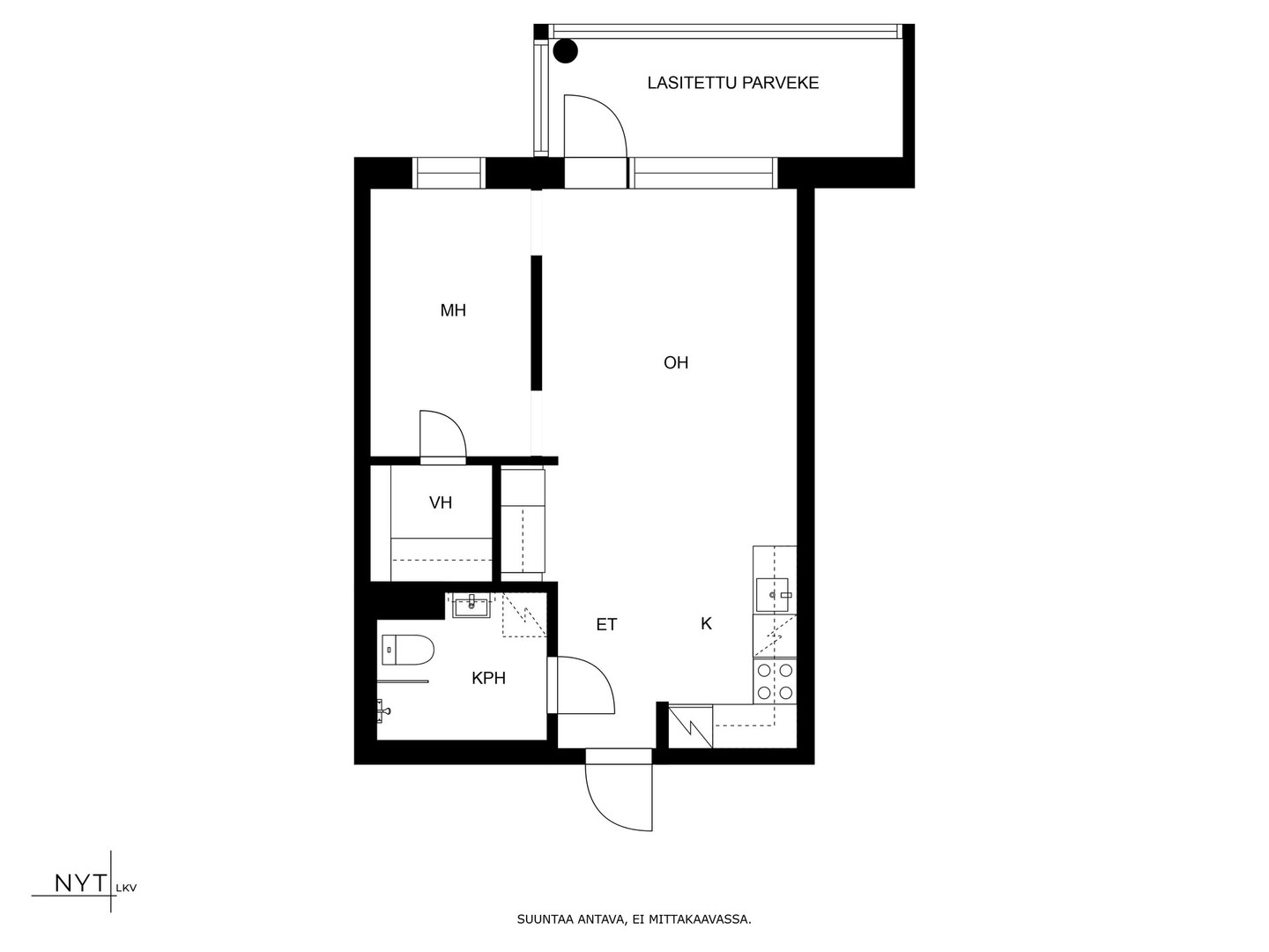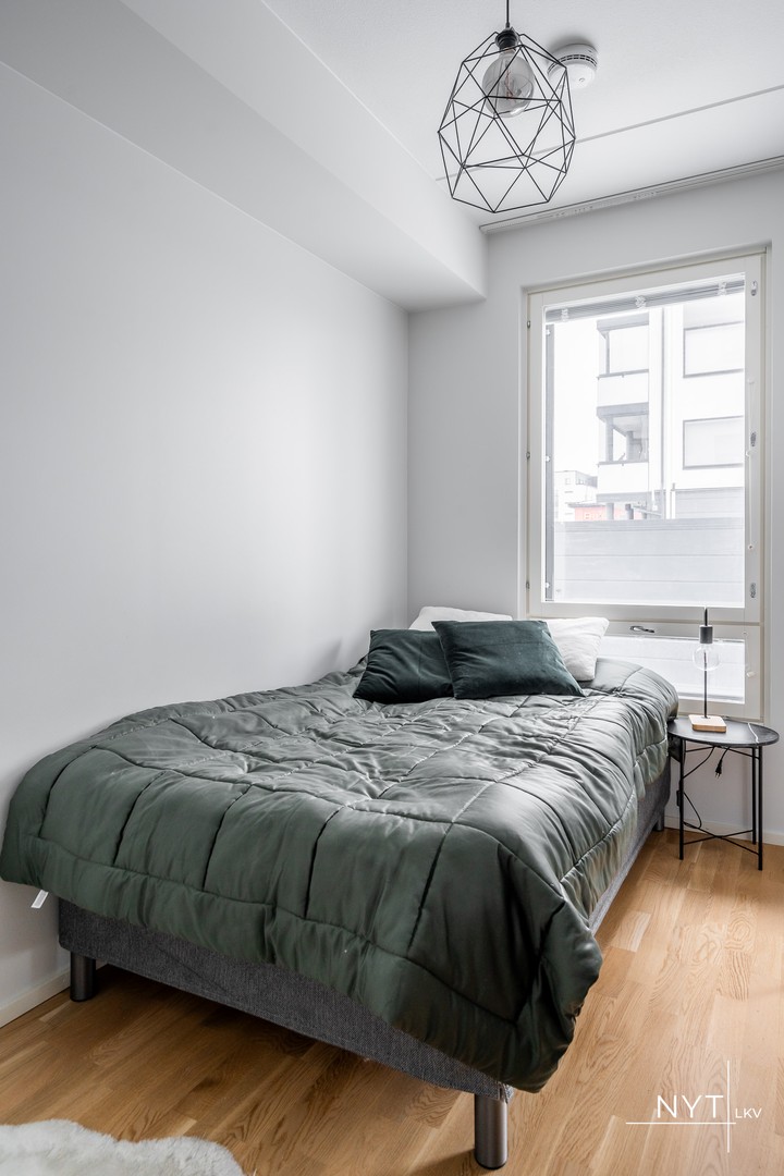 Olohuone ja keittiö ovat yhtä kokonaisuutta, jossa on hyvin tilaa kalustukselle, niin sohva- kuin ruokaryhmälle. Makuuhuoneeseen on kaksi kulkua, jolloin sängyn voi asettaa kätevästi huoneen keskelle. Makuuhuoneesta kulku tilavaan vaatehuoneeseen. Eteisessä lisäksi säilytystilaa. Kylpyhuoneessa tila kaikelle tarpeelliselle mitä tulee kylppäri- ja kodinhoitoaskareisiin.