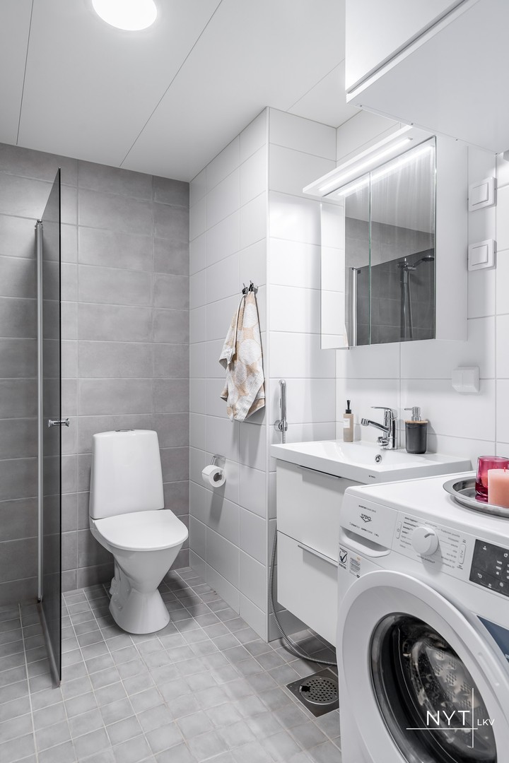 WC-istuin, suihku, suihkuseinä, pesukoneliitäntä, peilikaappi, pesuallas, allaskaappi ja bidee-suihku