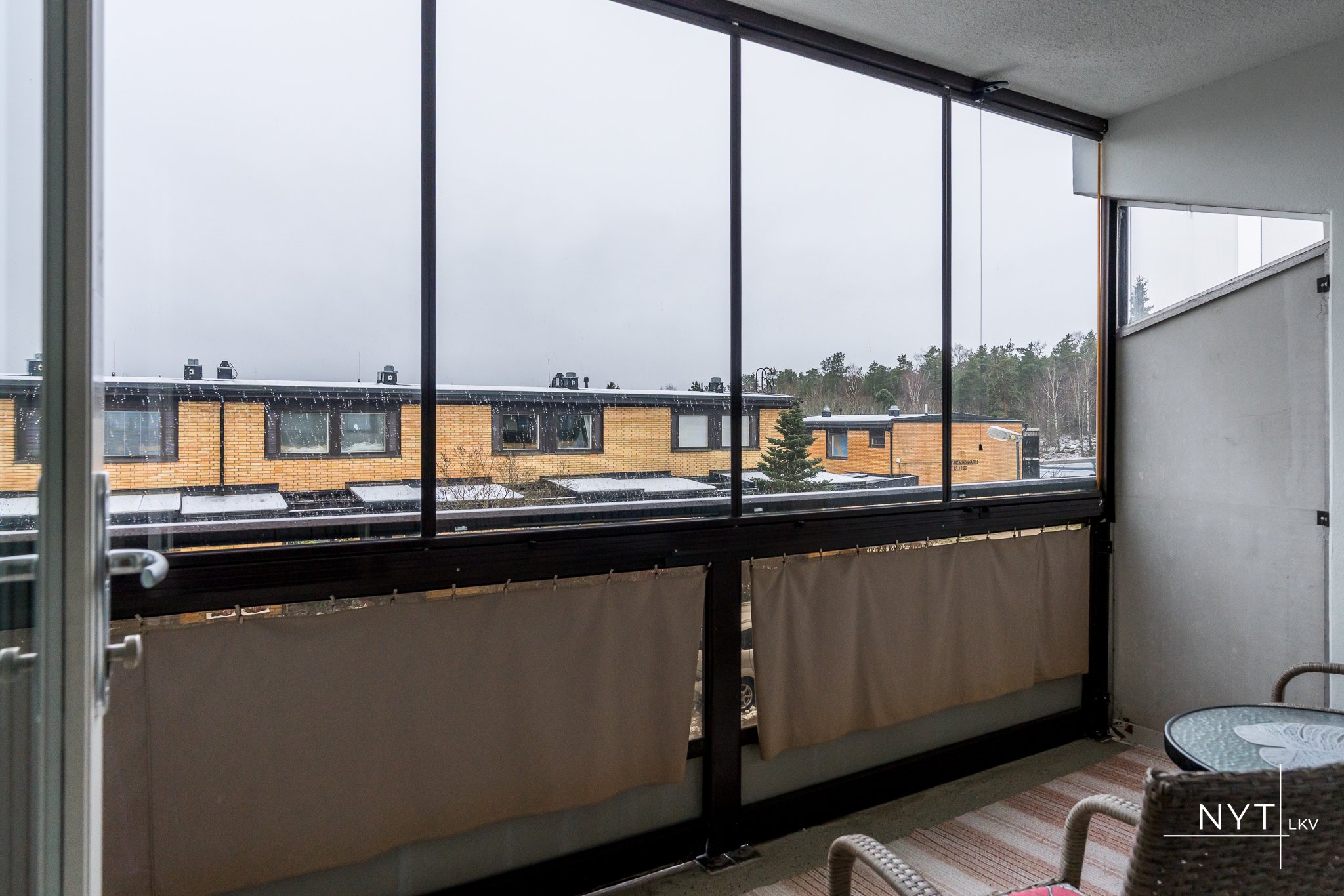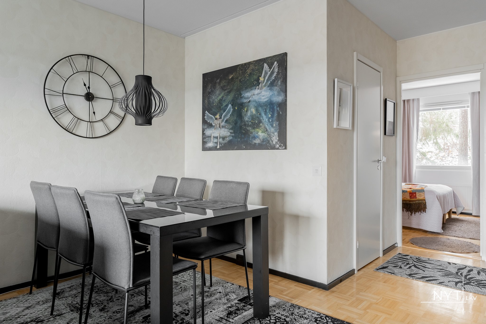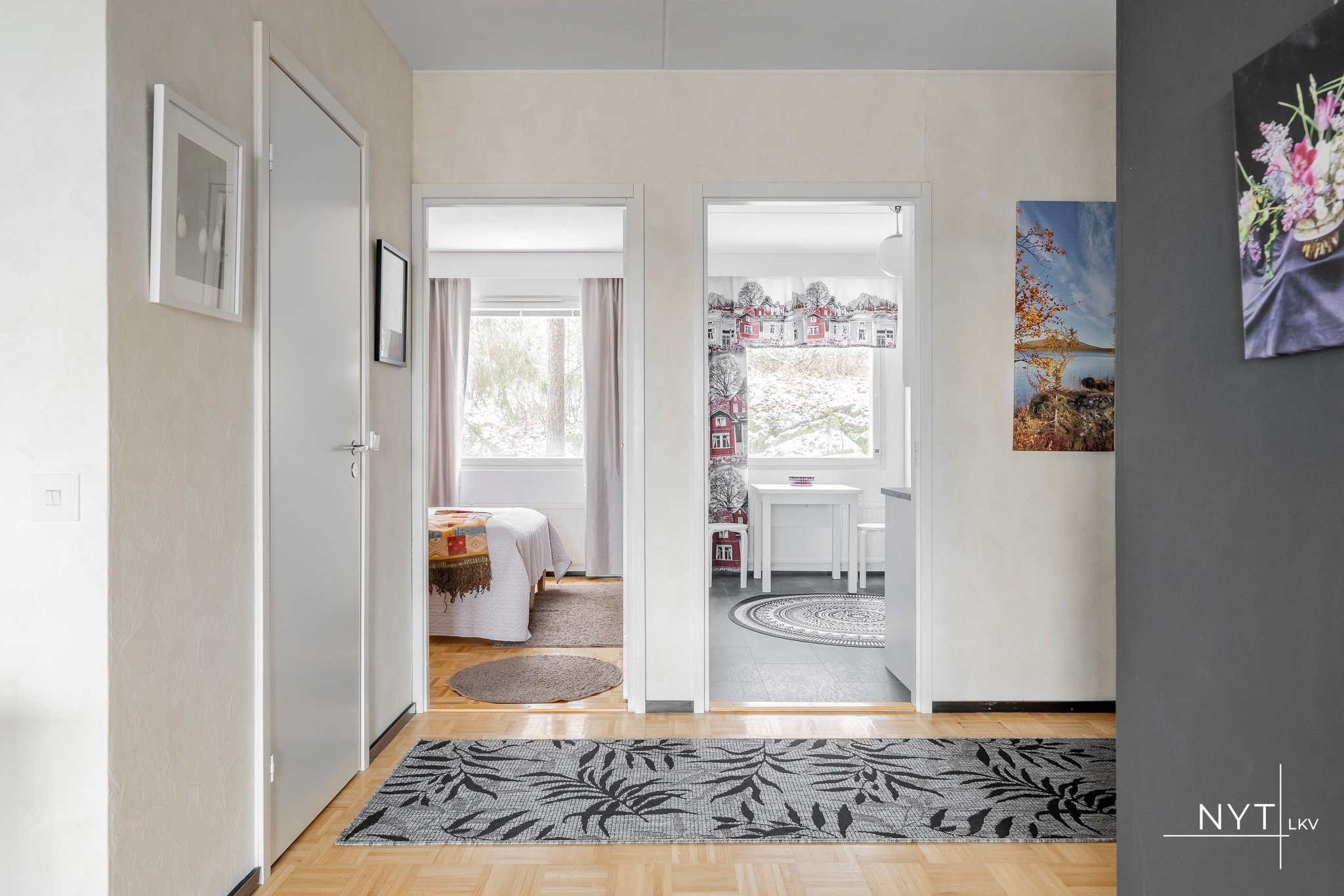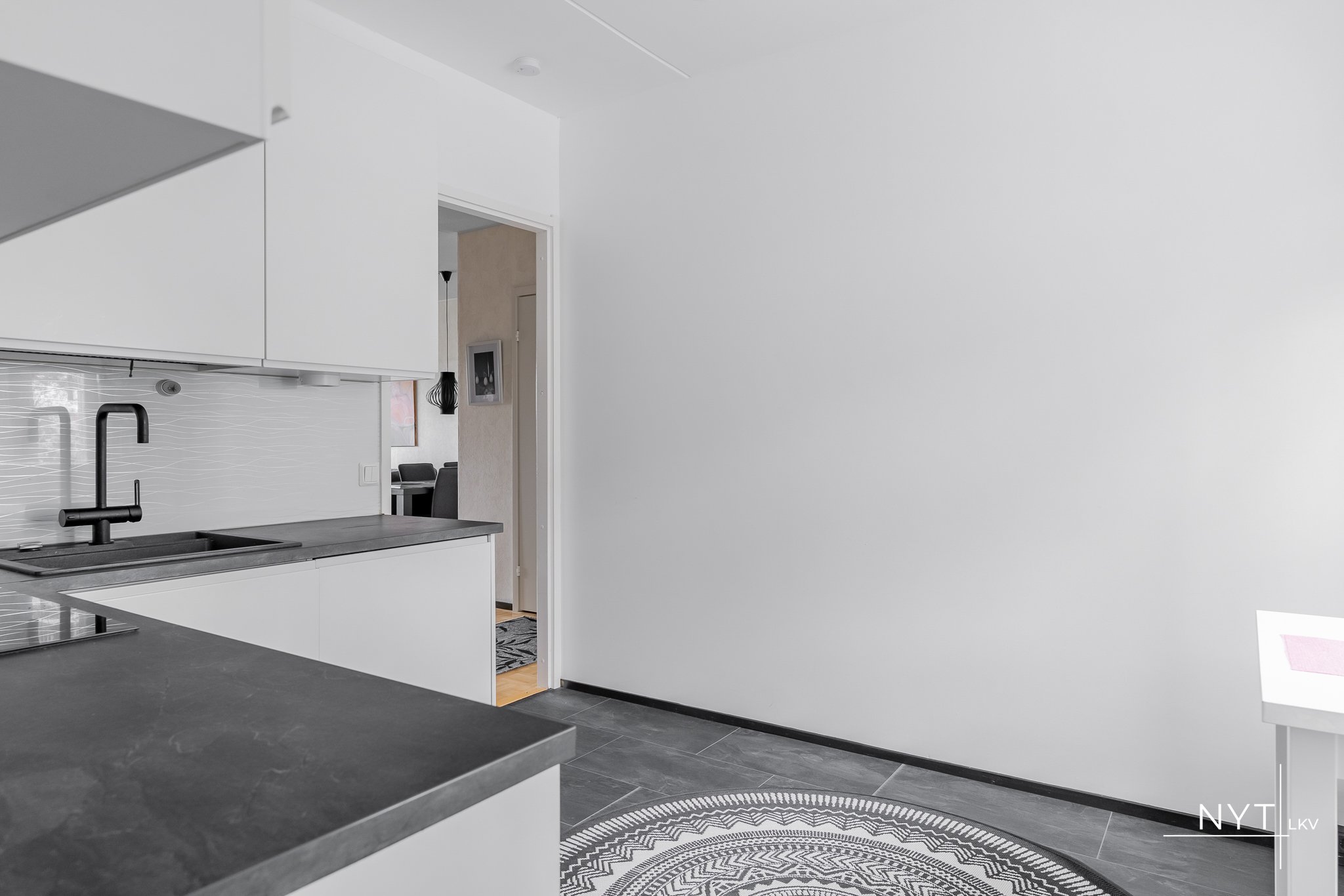 Asunnon keittiö on uusittu vuonna 2021 ja on varusteltu integroiduilla kodinkoneilla. Keittiöön mahtuu hienosti neljän hengen ruokaryhmä, olohuoneessa tilaa vielä isommalle. Olohuoneen ja makuuhuoneen lattioita koristaa varsin hyväkuntoinen mosaiikkiparketti. Olohuoneesta on kulku asunnon lasitetulle, etelään suuntaavalle parvekkeelle. Makuuhuone ja keittiö pohjoisen puolella, maisemana viihtyisä metsä, joka luo myös yksityisyyttä asuintiloihin.