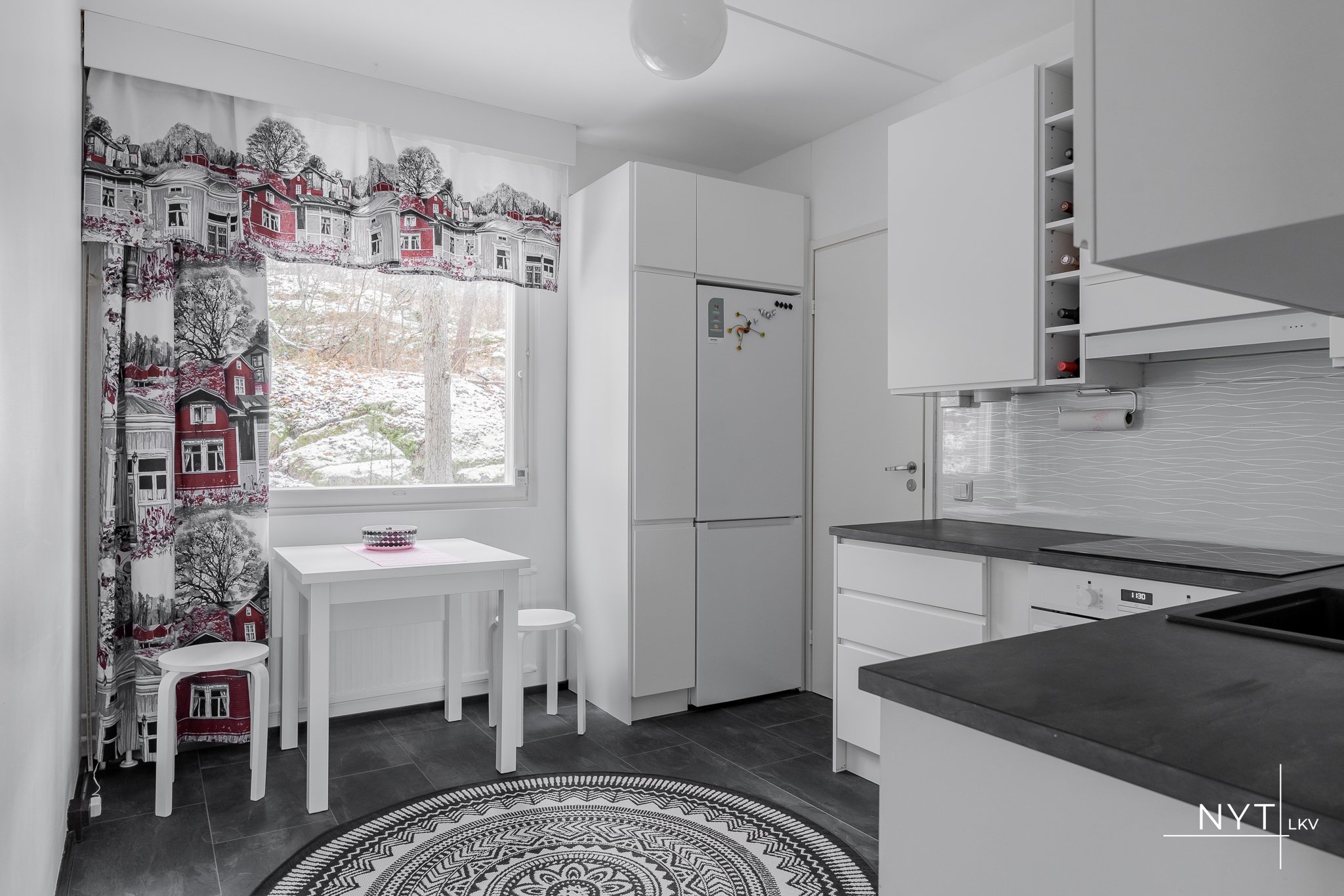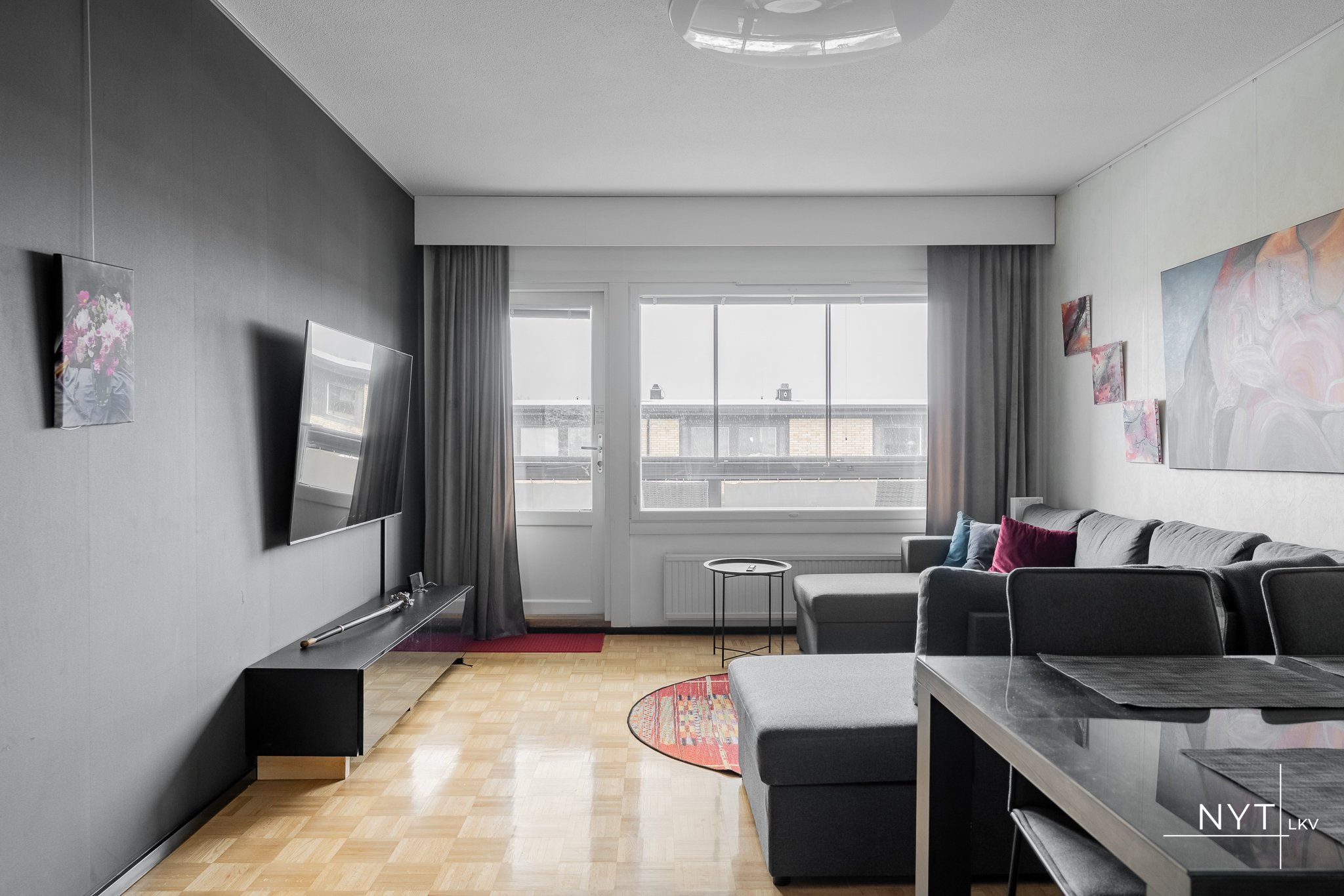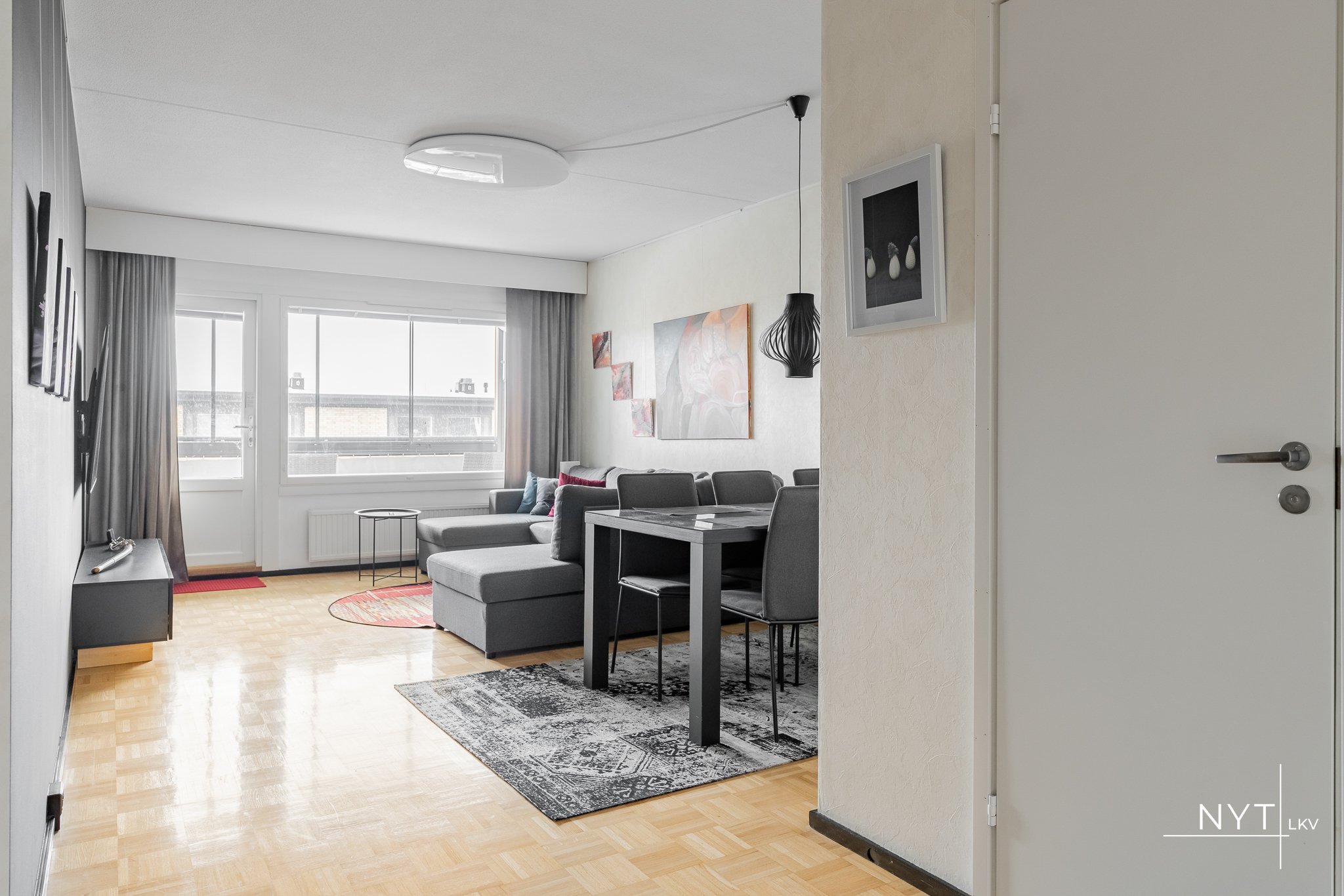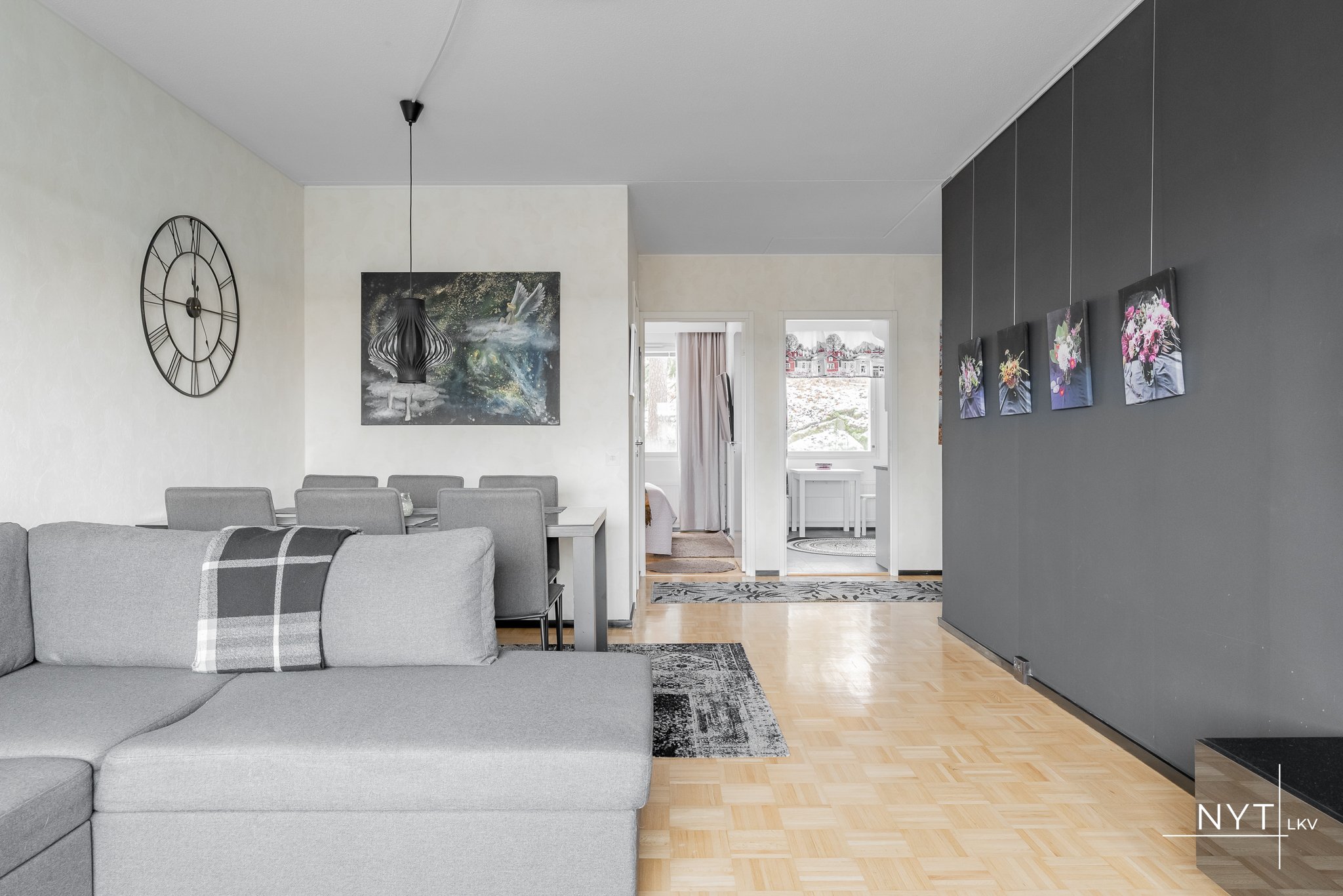 Asunnon keittiö on uusittu vuonna 2021 ja on varusteltu integroiduilla kodinkoneilla. Keittiöön mahtuu hienosti neljän hengen ruokaryhmä, olohuoneessa tilaa vielä isommalle. Olohuoneen ja makuuhuoneen lattioita koristaa varsin hyväkuntoinen mosaiikkiparketti. Olohuoneesta on kulku asunnon lasitetulle, etelään suuntaavalle parvekkeelle. Makuuhuone ja keittiö pohjoisen puolella, maisemana viihtyisä metsä, joka luo myös yksityisyyttä asuintiloihin.