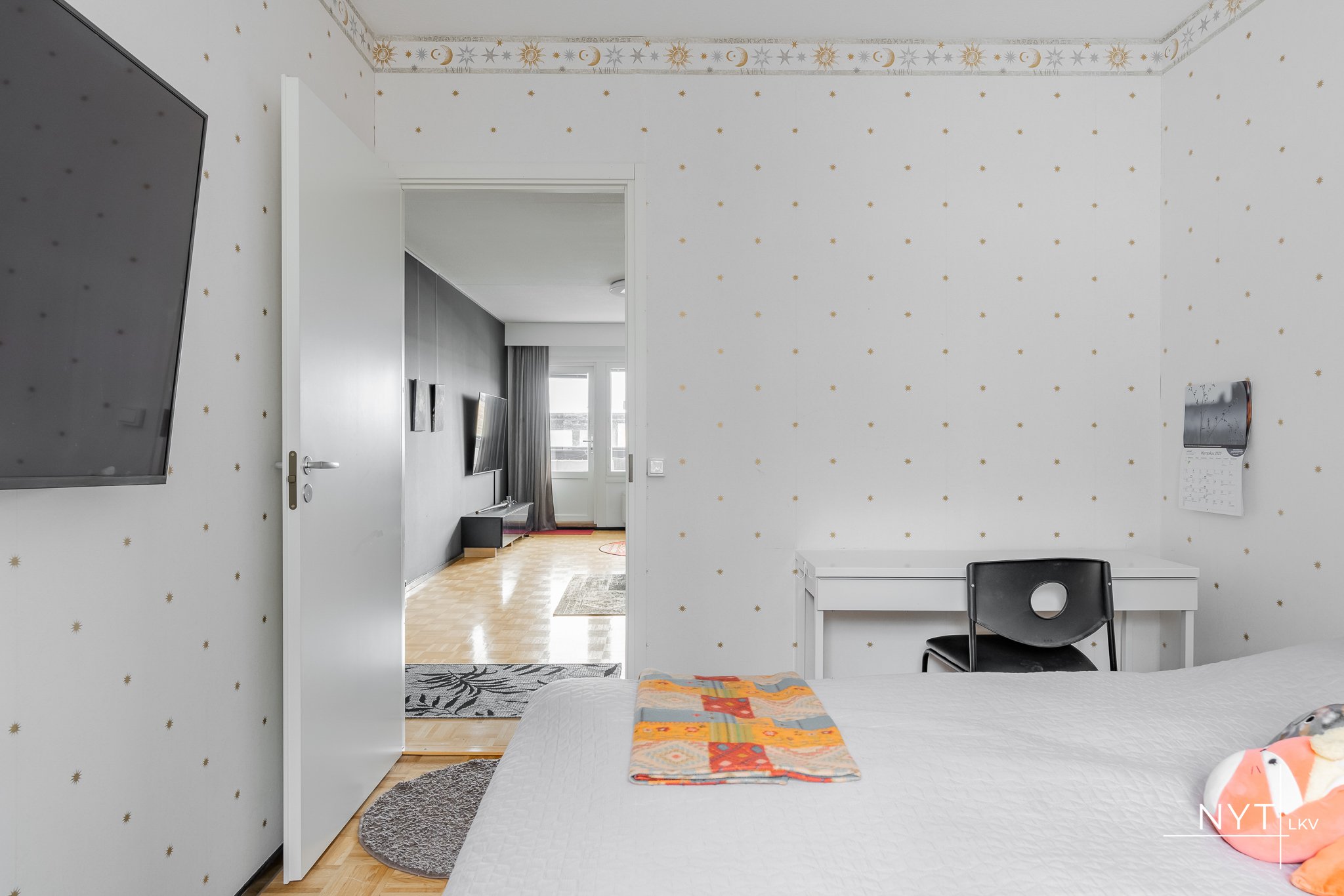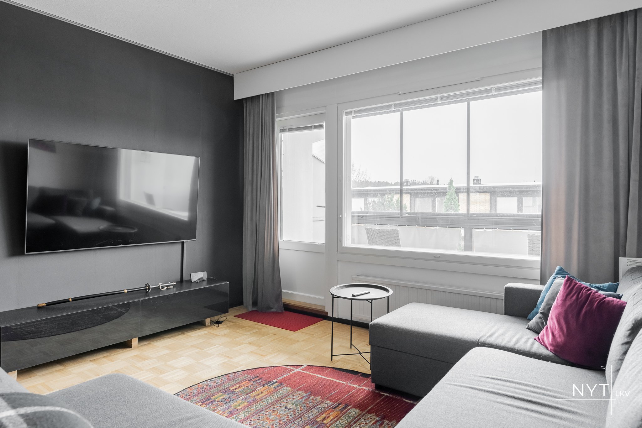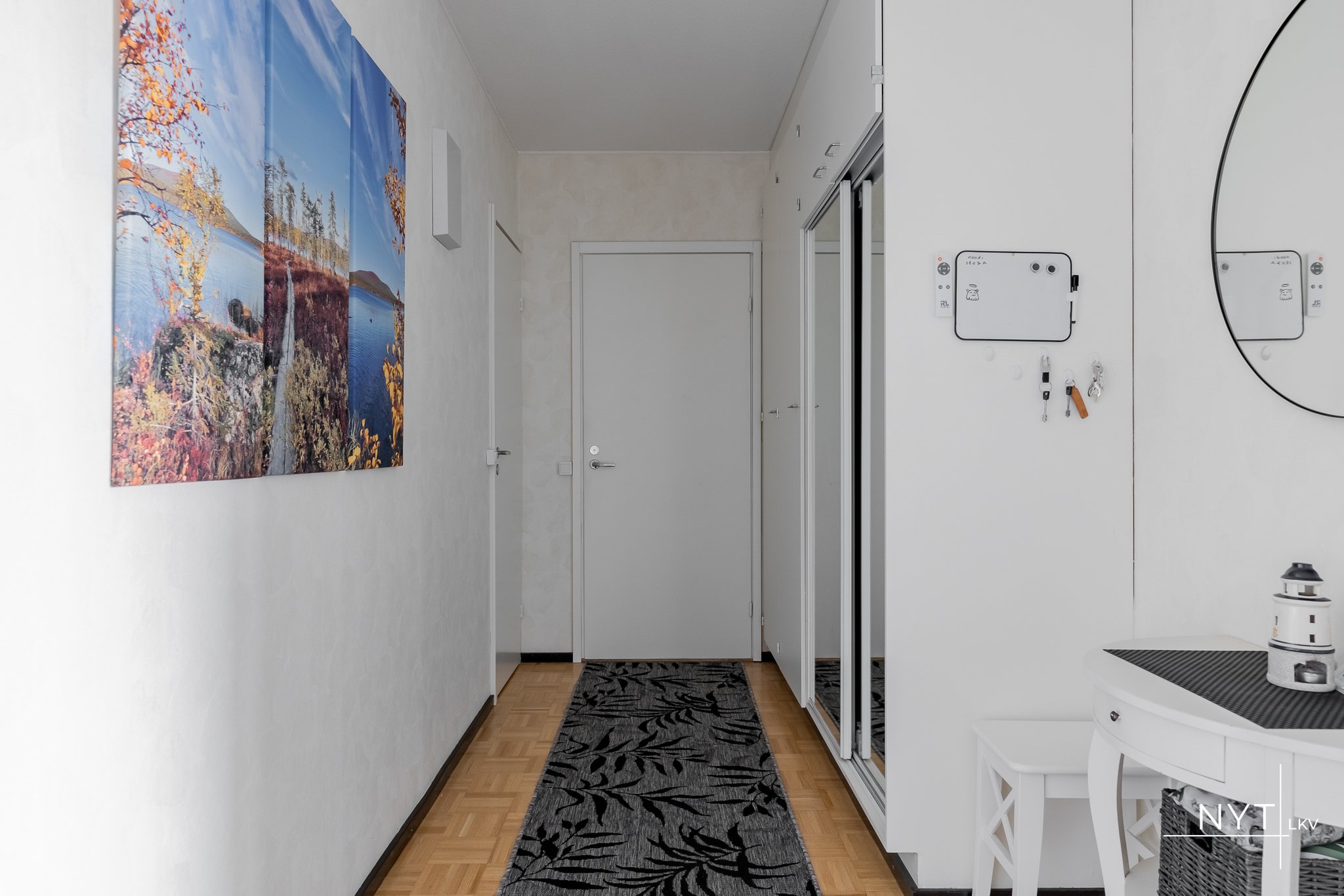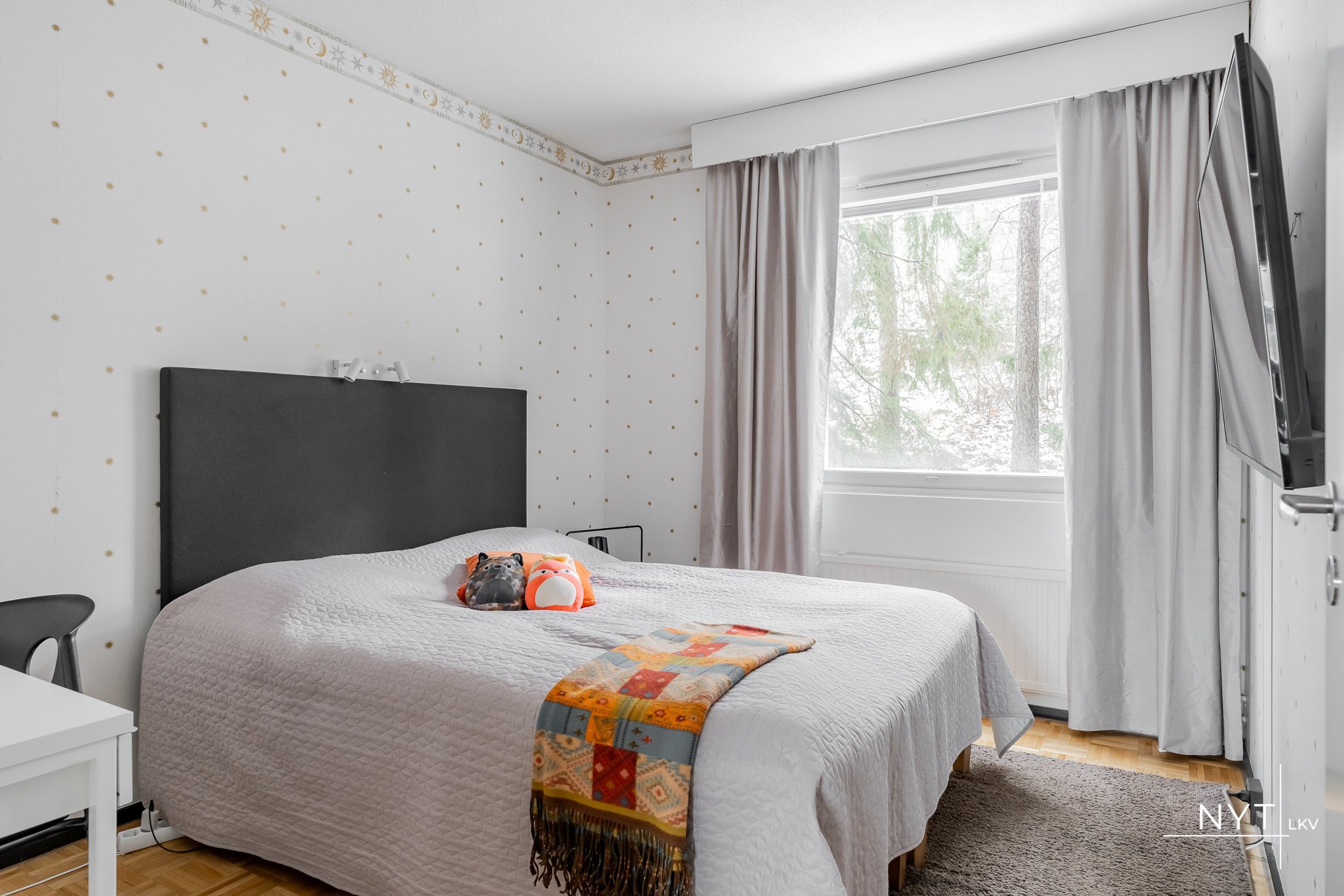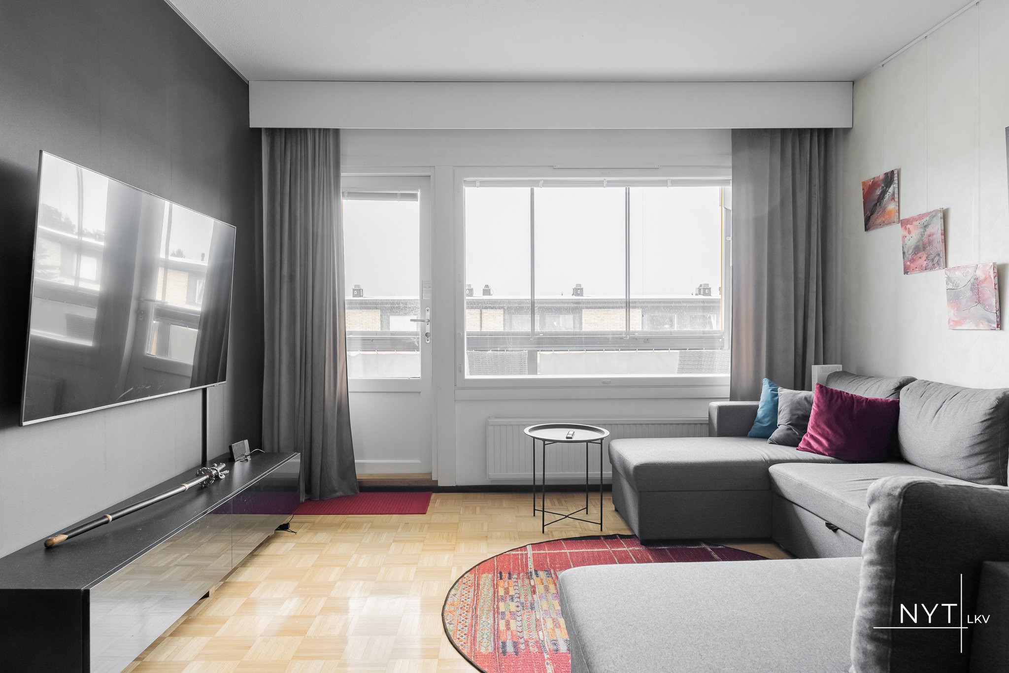 Asunnon keittiö on uusittu vuonna 2021 ja on varusteltu integroiduilla kodinkoneilla. Keittiöön mahtuu hienosti neljän hengen ruokaryhmä, olohuoneessa tilaa vielä isommalle. Olohuoneen ja makuuhuoneen lattioita koristaa varsin hyväkuntoinen mosaiikkiparketti. Olohuoneesta on kulku asunnon lasitetulle, etelään suuntaavalle parvekkeelle. Makuuhuone ja keittiö pohjoisen puolella, maisemana viihtyisä metsä, joka luo myös yksityisyyttä asuintiloihin.
