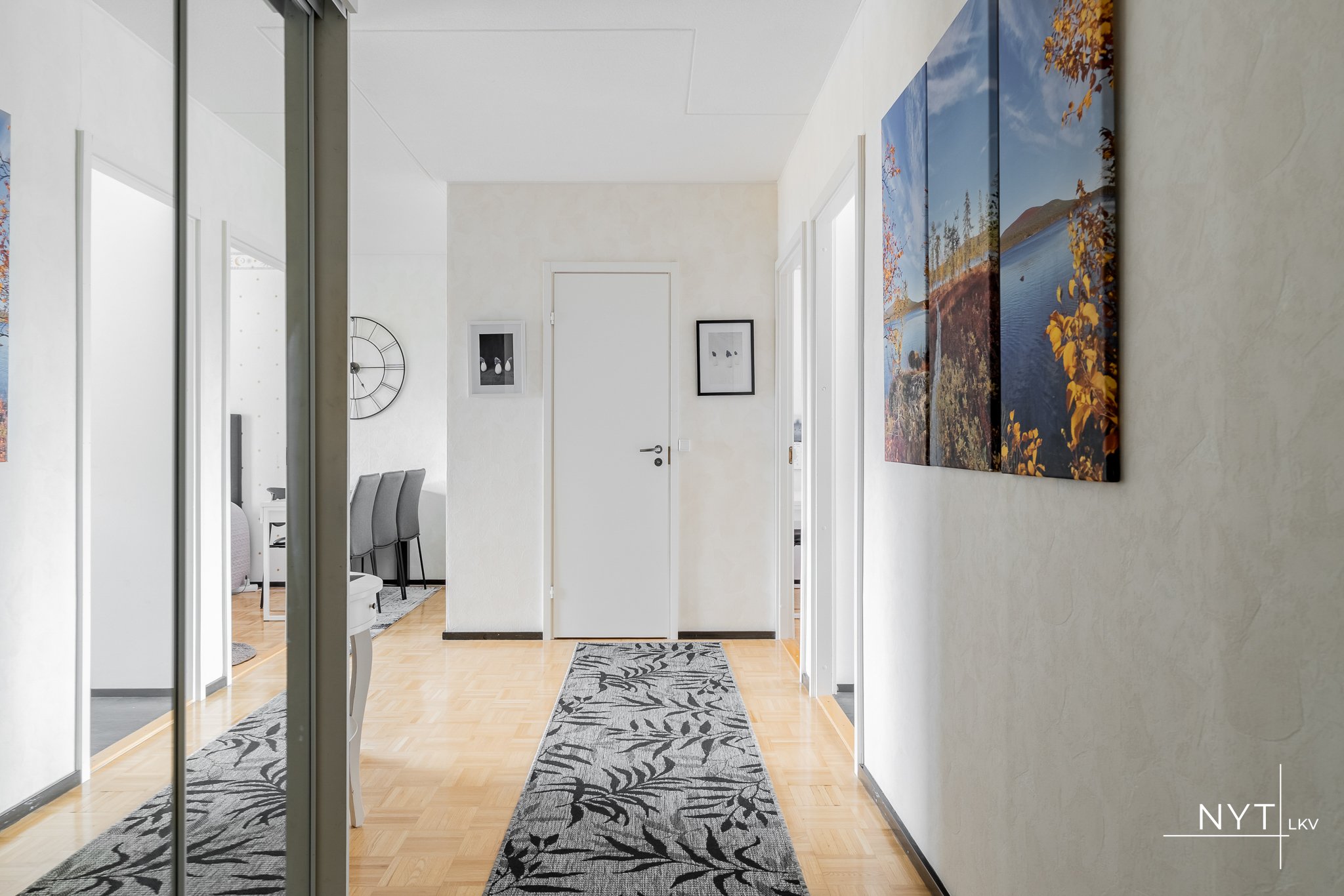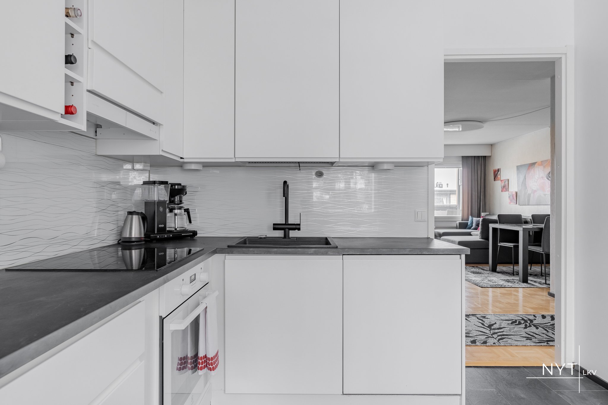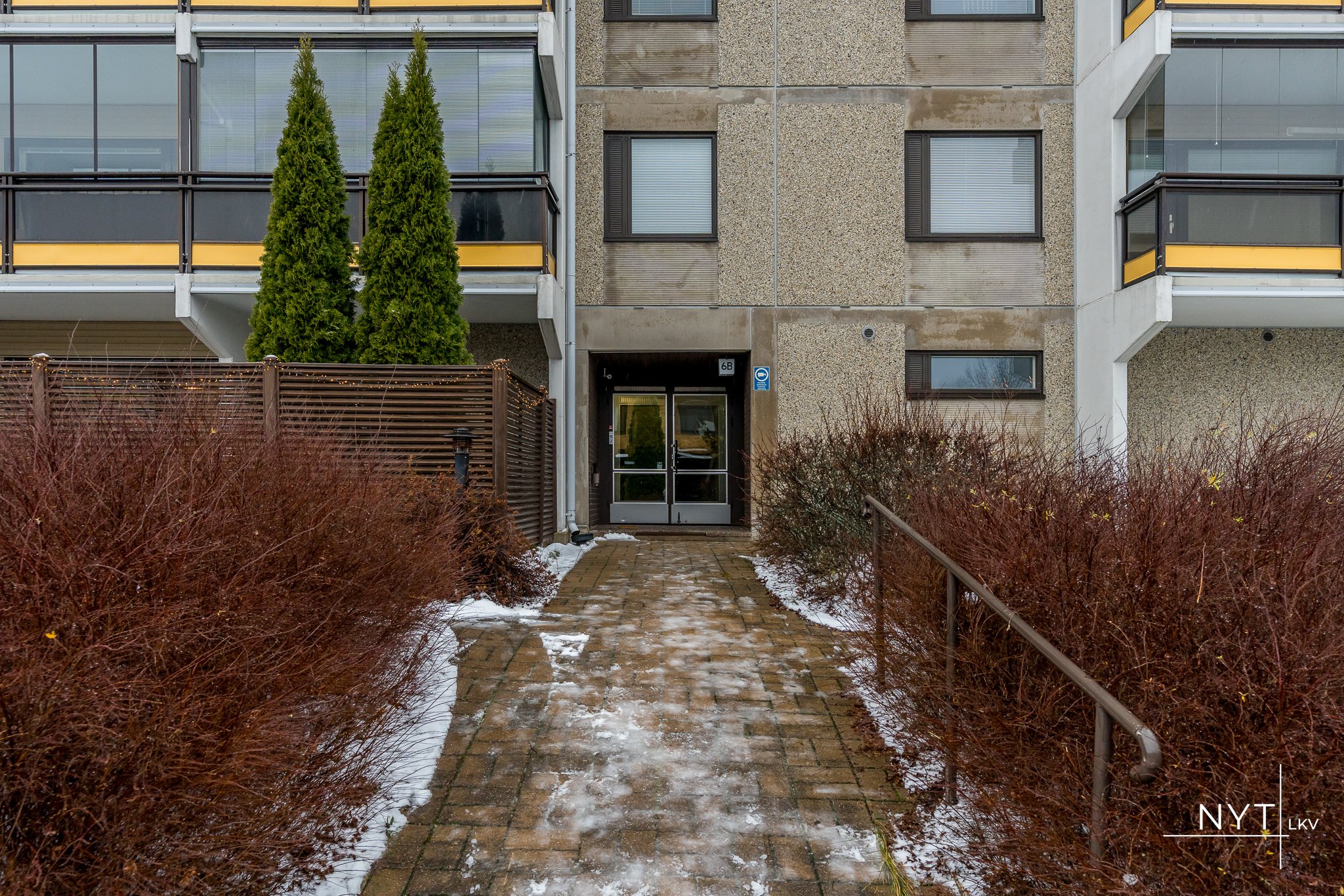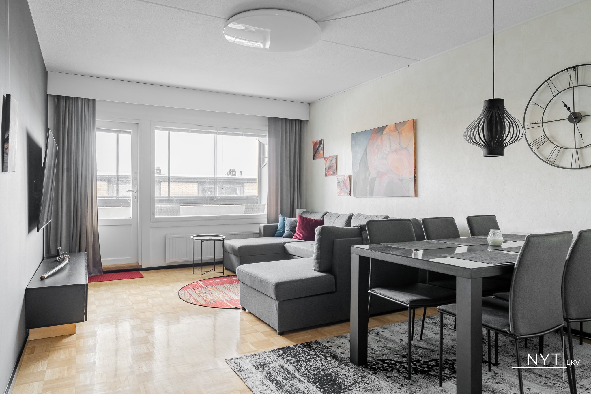 Asunnon keittiö on uusittu vuonna 2021 ja on varusteltu integroiduilla kodinkoneilla. Keittiöön mahtuu hienosti neljän hengen ruokaryhmä, olohuoneessa tilaa vielä isommalle. Olohuoneen ja makuuhuoneen lattioita koristaa varsin hyväkuntoinen mosaiikkiparketti. Olohuoneesta on kulku asunnon lasitetulle, etelään suuntaavalle parvekkeelle. Makuuhuone ja keittiö pohjoisen puolella, maisemana viihtyisä metsä, joka luo myös yksityisyyttä asuintiloihin.