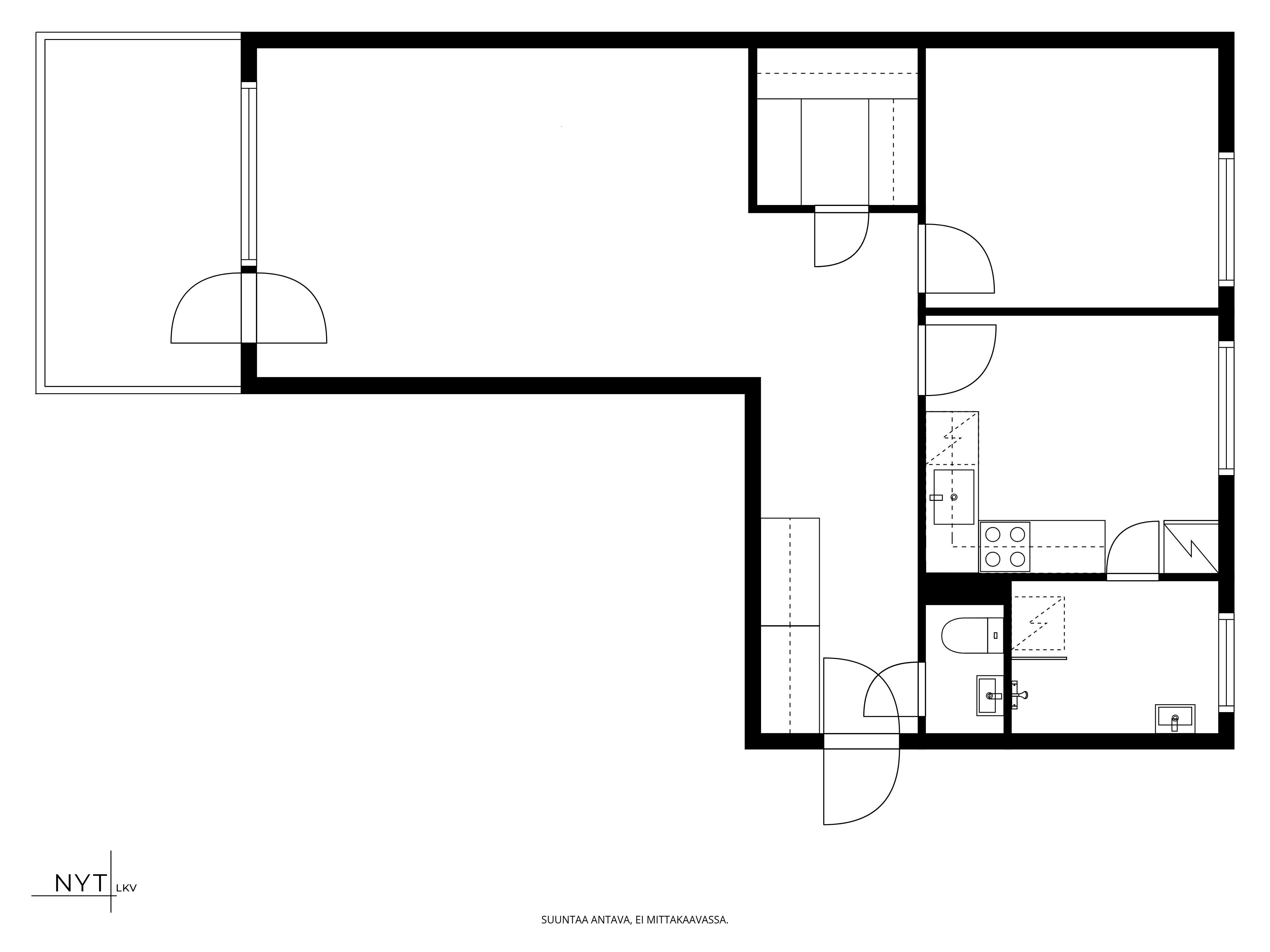 Olohuone ja parveke etelään Ratsukonkadulle ja Katariinanlaakson suuntaan. Makuuhuone ja keittiö pohjoiseen.