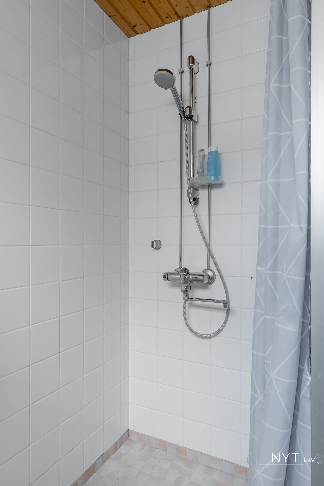 Suihku, pesukoneliitäntä, peili, pesuallas ja suihkuseinä