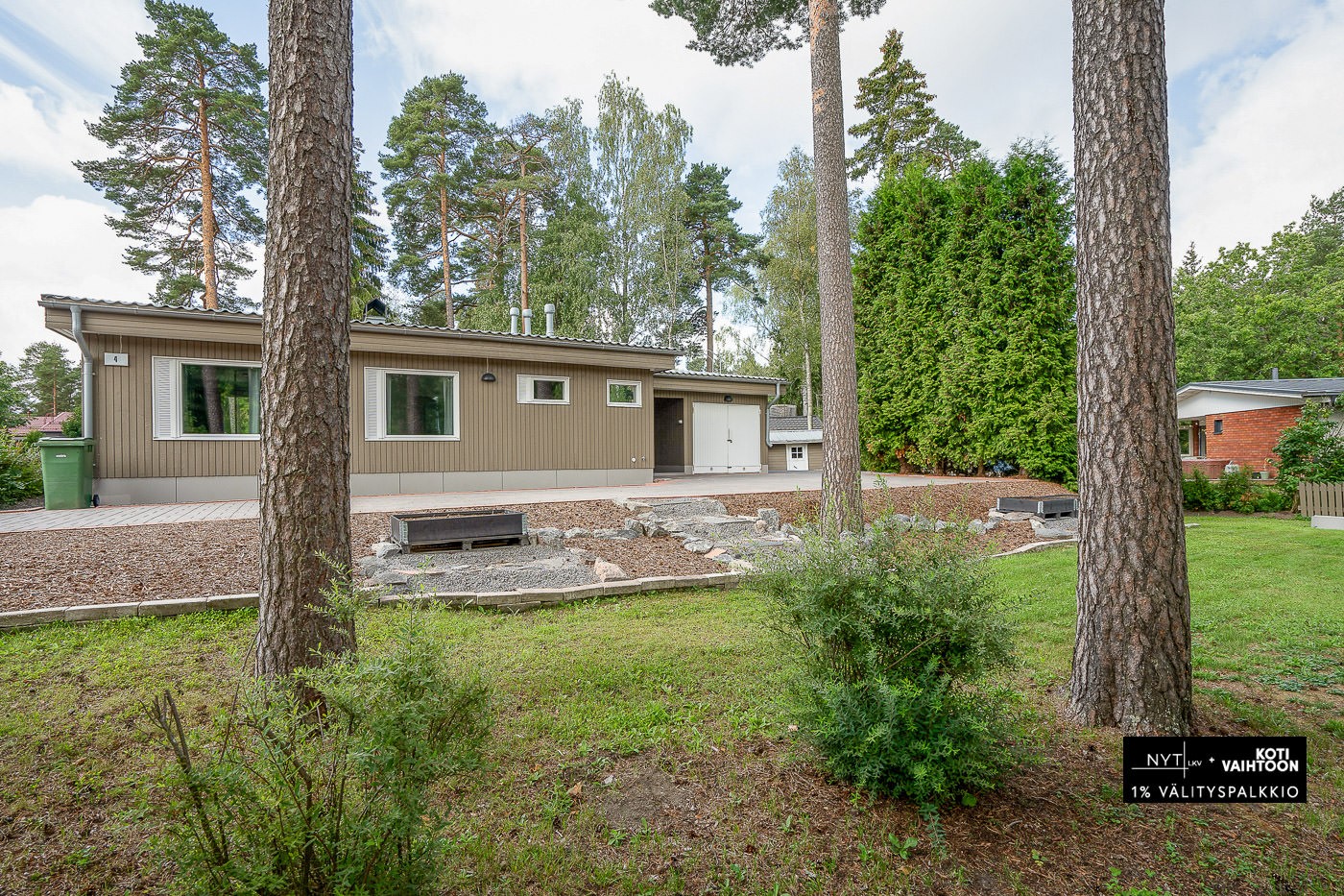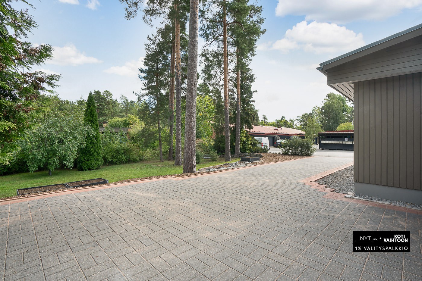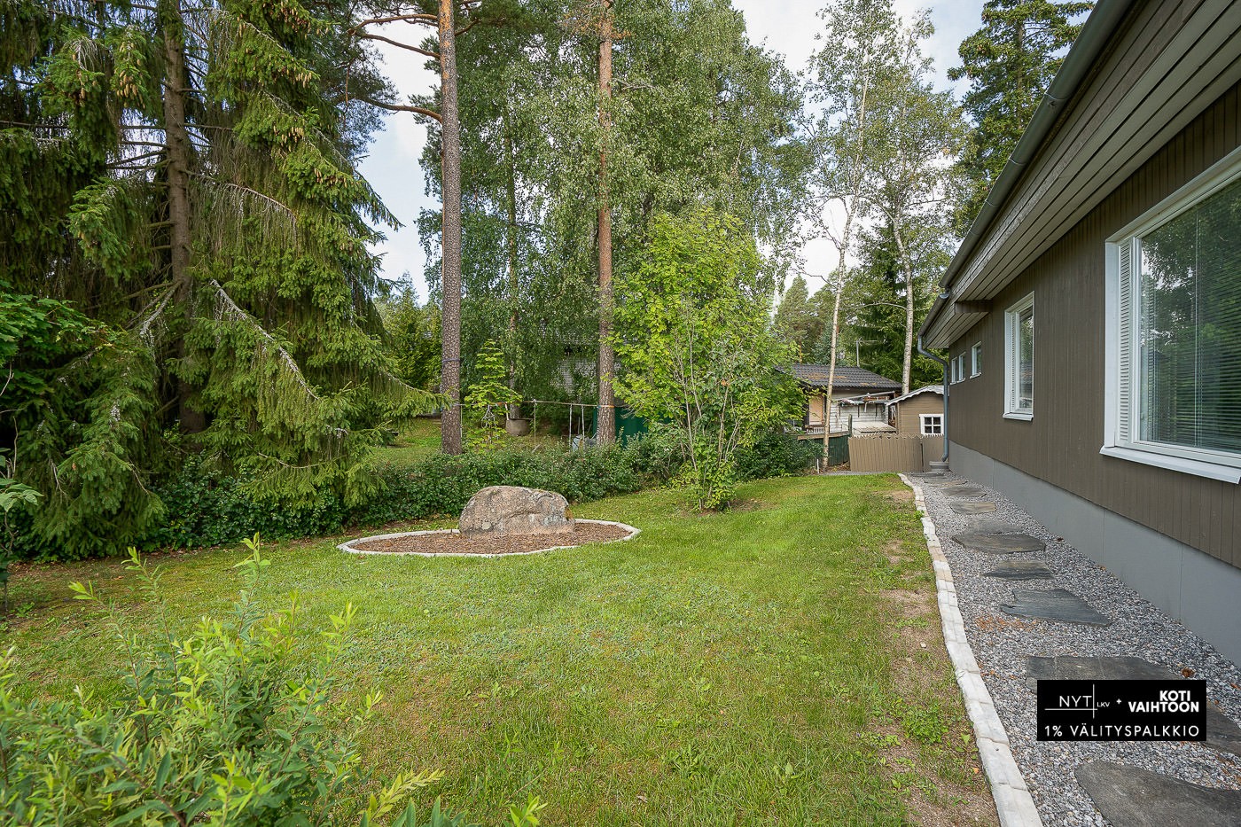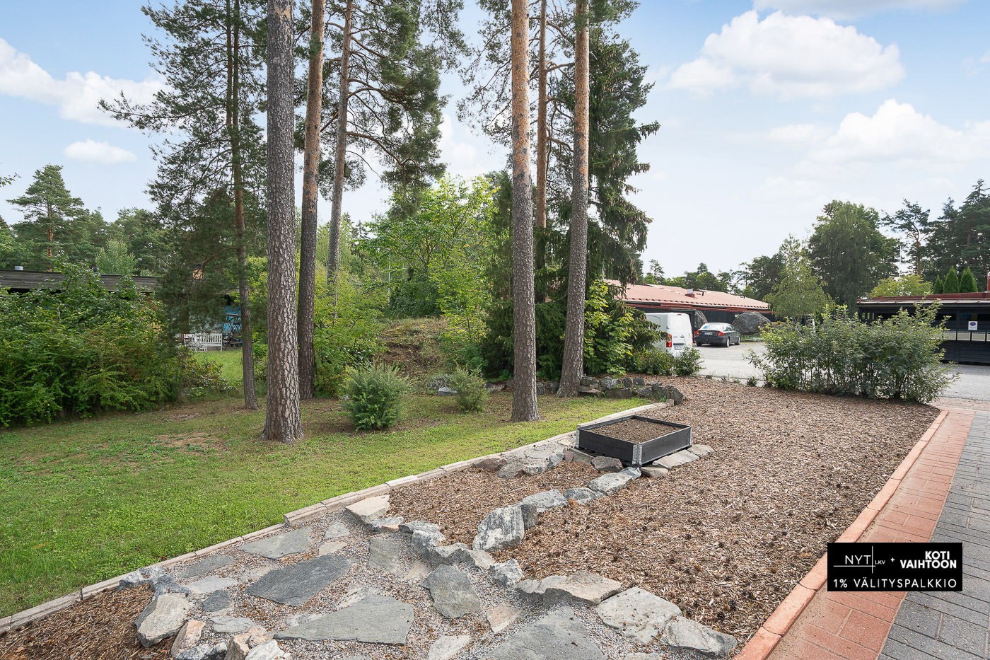 Tasainen, nurmikkoinen tontti. Harvaa puustoa ja muutamia istutuksia. Pihatie kiveytetty.