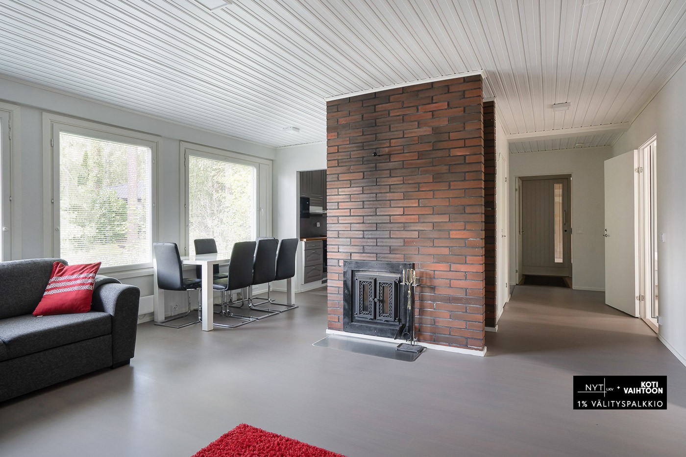 Sisäänkäynti taloon on väljä ja eteisestä löytyy vaatehuoneenomainen tila ulkovaatteille, kengille, lastenrattaille jne. Sisäänkäynnistä oikealle avautuu keittiö, jonka tasot, välitila ja kodinkoneet on uusittu 2021. Keittiöstä kulku eteiseen ja olohuoneeseen. Olohuone on suuren takan koristama ja kolmen suuren ikkunan luonnonvalaisema viihtyisä tila. Olohuoneessa ilmalämpöpumpun sisäyksikkö, joka tehostaa talon lämmitystä ja viilennystä.
