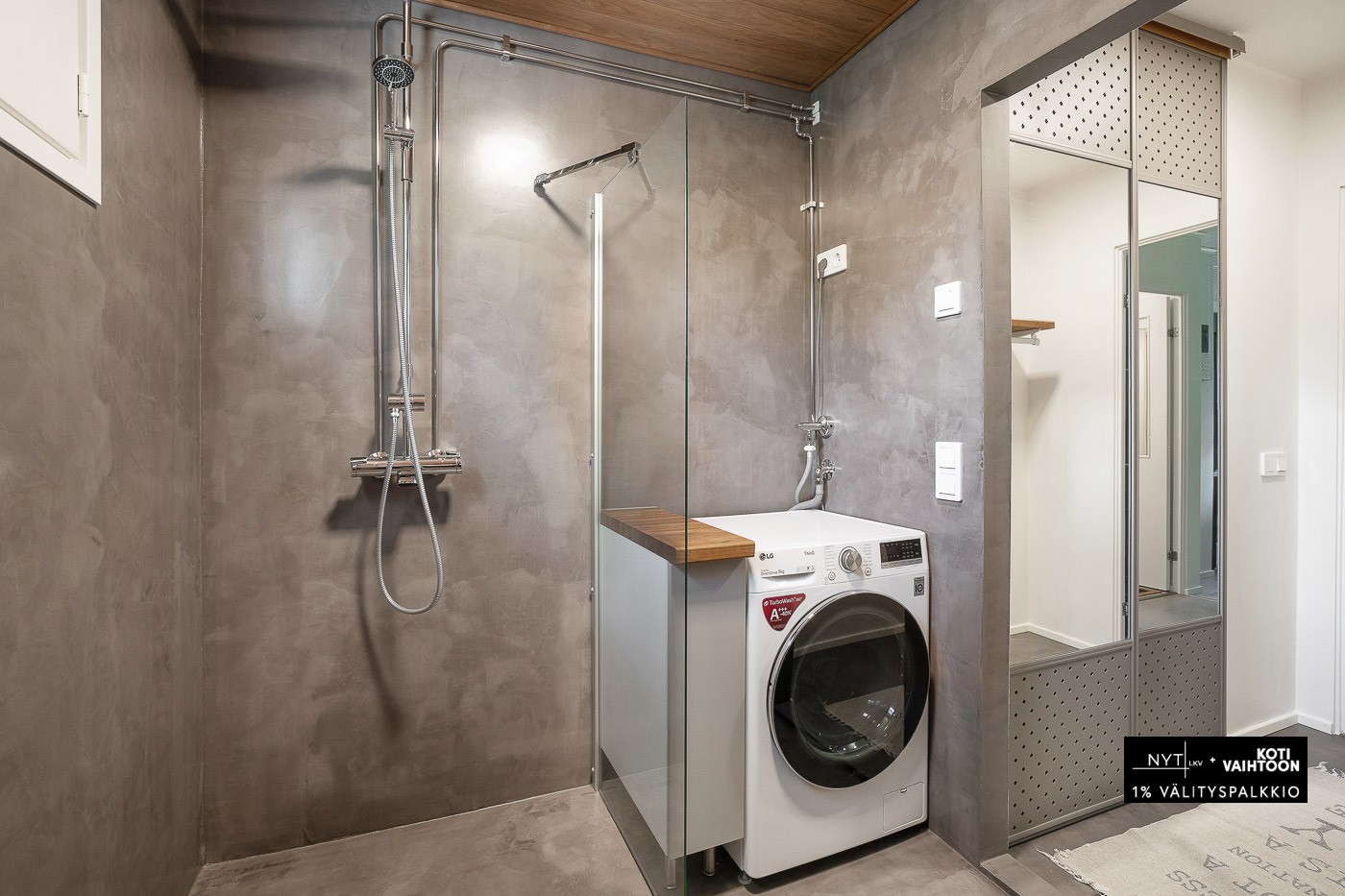 Suihku, suihkuseinä, pesukoneliitäntä ja lattialämmitys