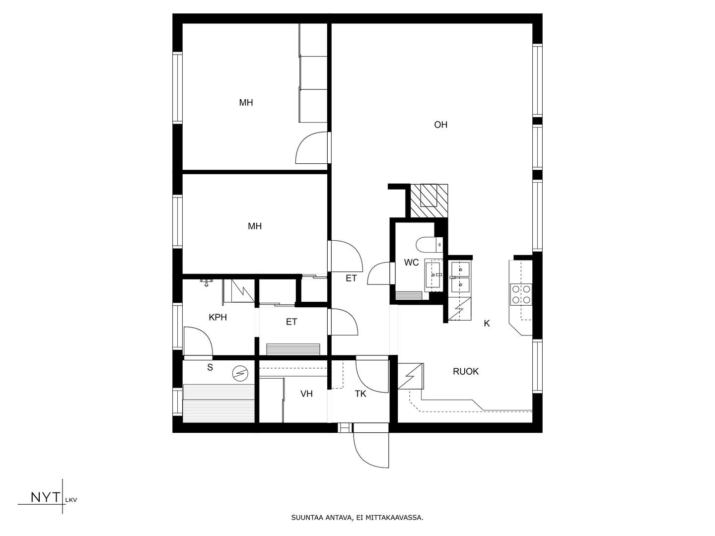 Ei tarkistusmitattu. Pinta-alat saattavat tämän ikäisissä kohteissa (rekisteröity ennen 1.1.1992) poiketa olennaisestikin asuinrakennusten nykyisten mittaustapojen ja standardien (SFS 5139) mukaan laskettavasta asuintilojen pinta-alasta. Pinta-ala voi siis olla edellä mainittua pienempi tai suurempi.
