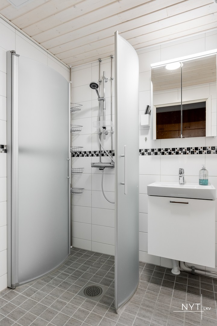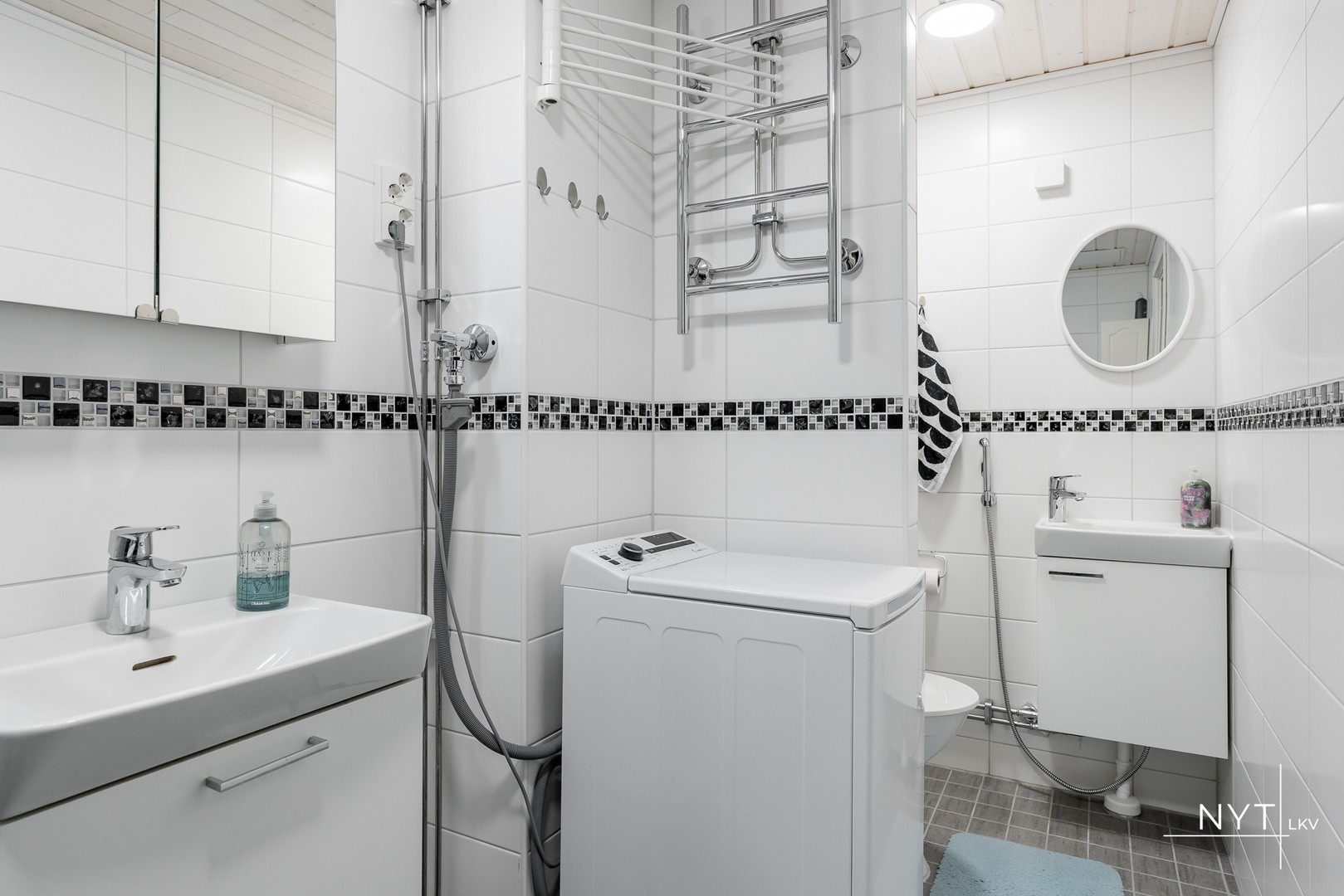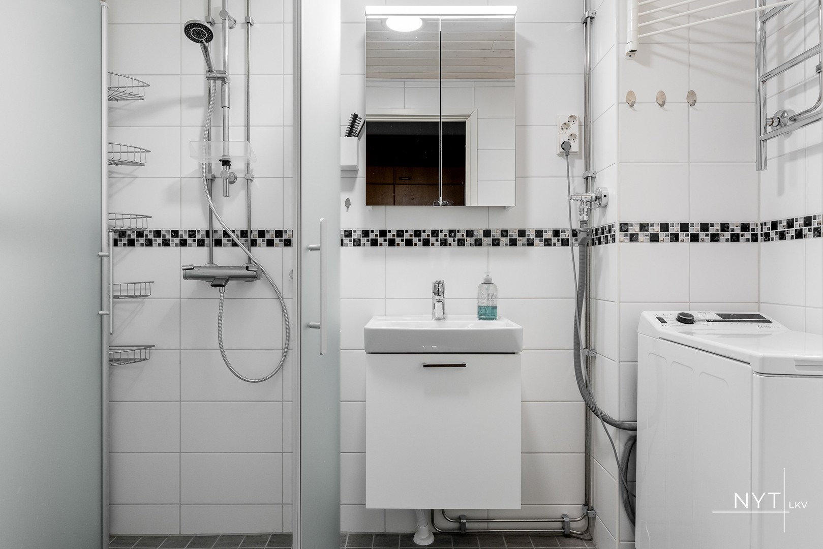 Pesuallas (2x), wc-istuin, suihku, suihkukaappi, pesukoneliitäntä, peilikaappi, bidee-suihku ja allaskaappi
