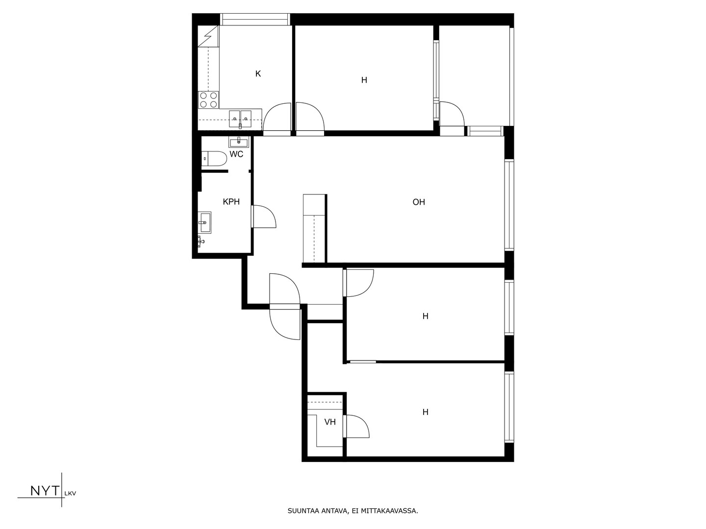 Ei tarkistusmitattu. Pinta-alat saattavat tämän ikäisissä kohteissa (yhtiö rekisteröity ennen 01.01.1992) poiketa olennaisestikin asuinrakennusten nykyisten mittaustapojen ja standardien (SFS 5139) mukaan laskettavasta asuintilojen pinta-alasta. Pinta-ala voi siis olla edellä mainittua pienempi tai suurempi.
